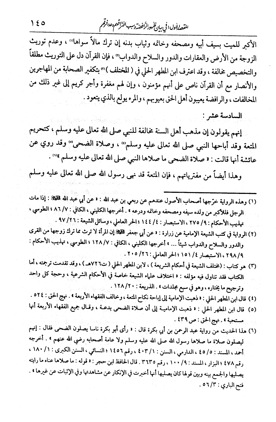الأكبر للميت بسيف أبيه ومصحفه وخاتمه وثياب بدنه إن ترك مالا سواها، وعدم توريث الزوجة من الأرض والعقارات والدور والسلاح والدواب، فإن القرآن دل عل التوريث مطلقا، والتخصيص مخالفة. وقد اعترف ابن المطهر الحلي في المختلف بتكفير الصحابة من المهاجرين والأنصار مع أن القران ناص على أنهم مؤمنون {لَهُمْ مَغْفِرَةٌ وَرِزْقٌ كَرِيمٌ}. إلى غير ذلك من المخالفات. والرافضة يعيبون أهل الحق بعيوبهم، والمرء يولع بالذي يتعود.