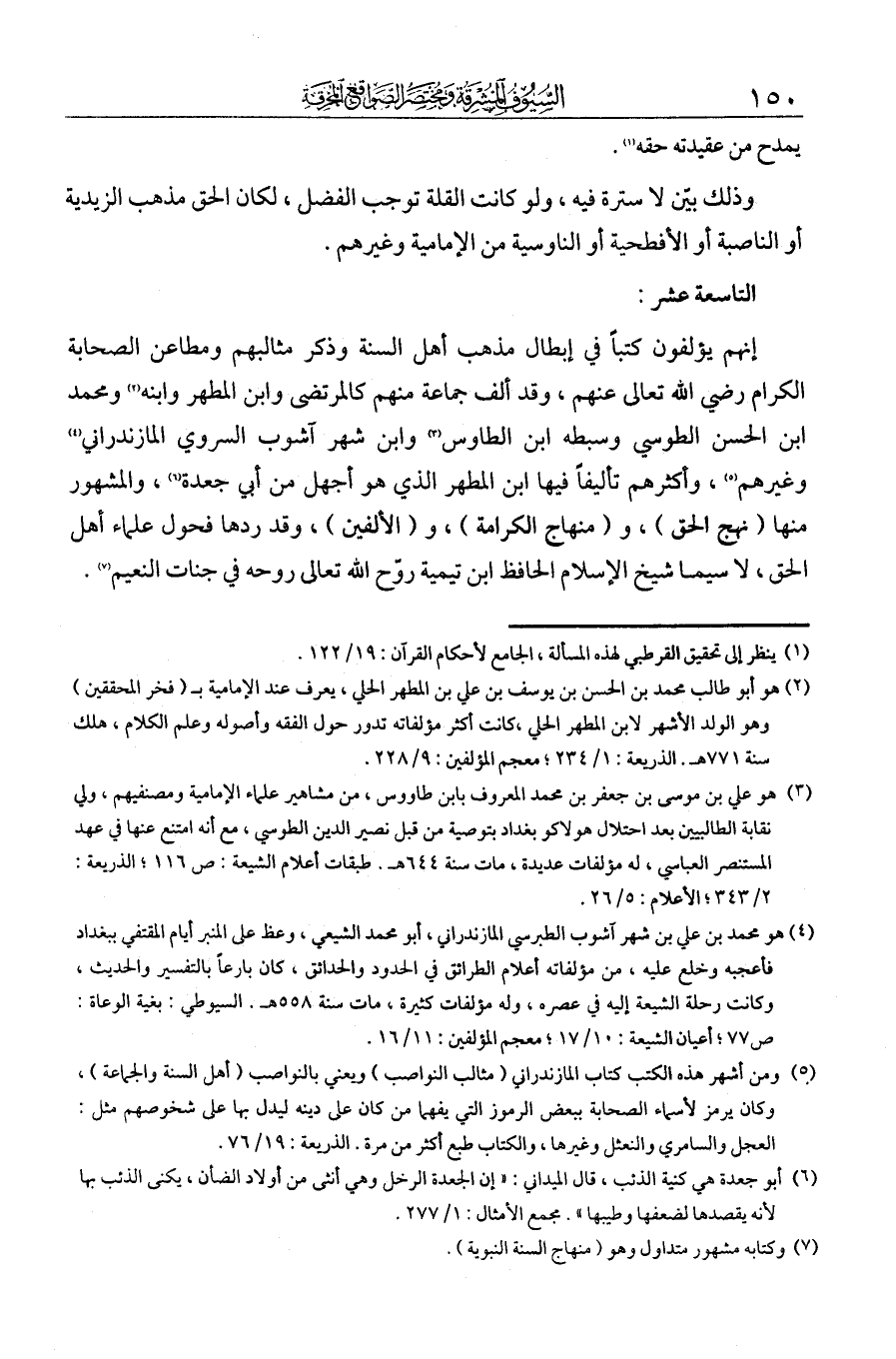 التاسعة عشر: إنهم يؤلفون كتبا في إبطال مذهب أهل السنة وذكر مثالبهم ومطاعن الصحابة الكرام رضي الله تعالى عنهم، وقد ألف جماعة منهم كالمرتضى وابن المطهر وابنه ومحمد بن الحسن الطوسي وسبطه ابن الطاوس وابن شهر آشوب السروي المازندراني وغيرهم، وأكثرهم تأليفا فيها ابن المطهر الذي هو أجهل من أبي جعدة، والمشهور منها منهج الحق ومنهاج الكرامة والألفين. وقد ردها فحول علماء أهل الحق، لا سيما شيخ الإسلام الحافظ ابن تيمية روح الله تعالى روحه في جنات النعيم.
