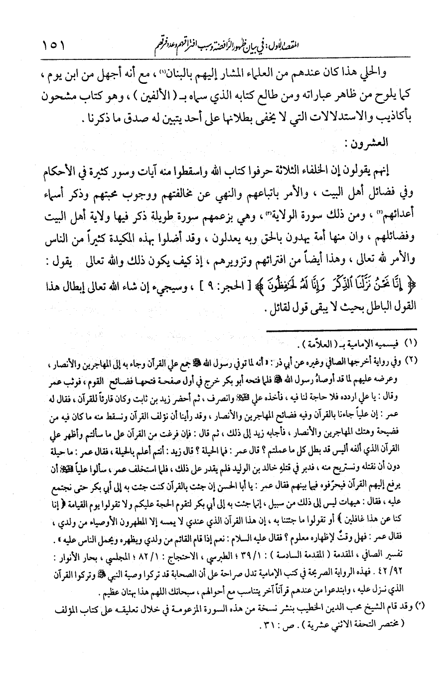 العشرون: إنهم يقولون إن الخلفاء الثلاثة حرفوا كتاب الله وأسقطوا منه آيات وسور كثيرة في الأحكام وفي فضائل أهل البيت والأمر باتباعهم والنهي عن مخالفتهم ووجوب محبتهم وذكر أسماء أعدائهم، ومن ذلك سورة الولاية، وهي بزعمهم سورة طويلة ذكر فيها ولاية أهل البيت وفضائلهم، وأن منها أئمة يهدون بالحق وبه يعدلون.