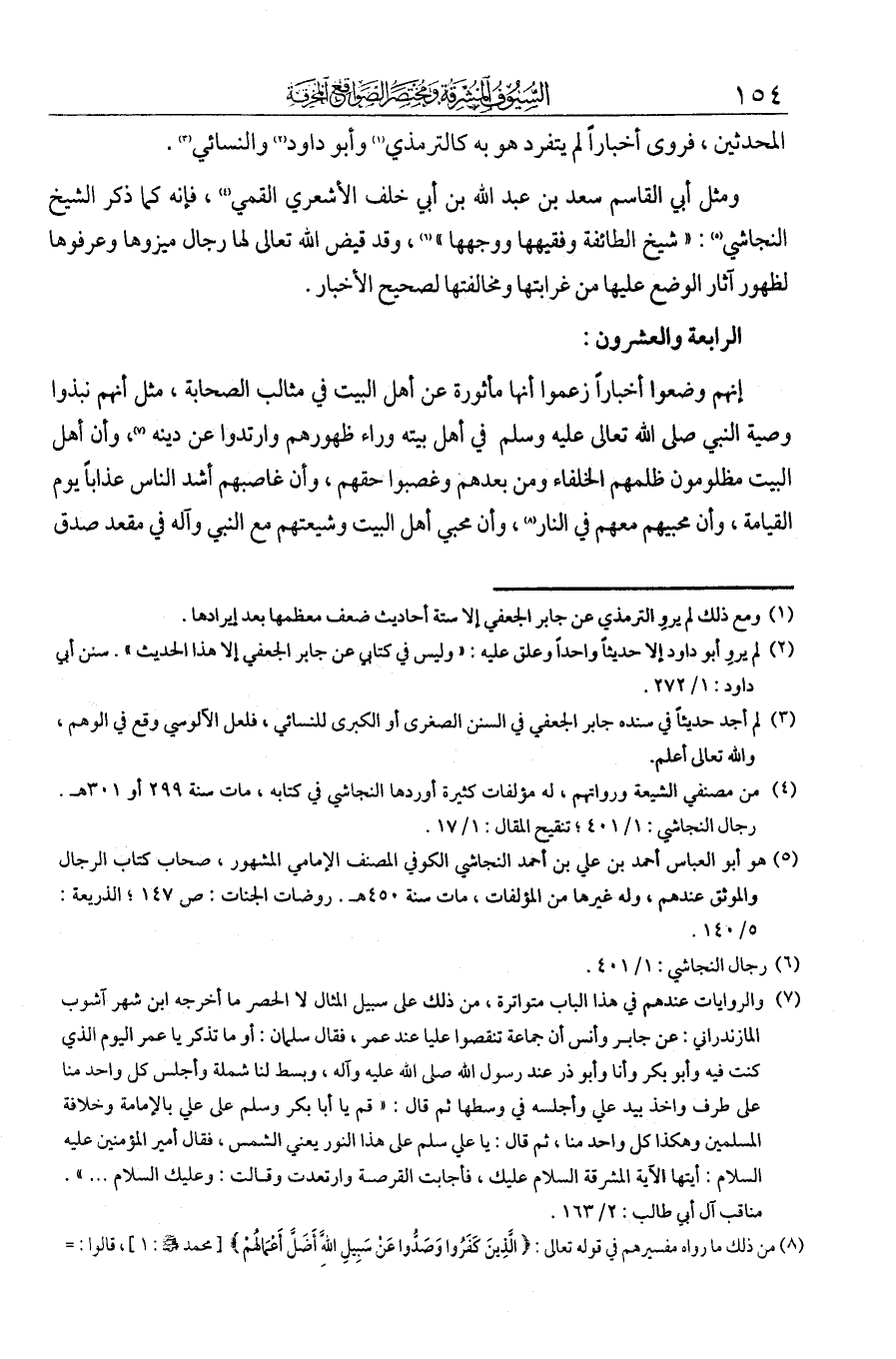 المحدثين فروى أخبارا لم يتفرد هو بها كالترمذي وأبو داود والنسائي. ومثل أبي القاسم سعد بن عبد الله بن أبي خلف الأشعري القمي، فإنه كما ذكر الشيخ النجاشي: شيخ الطائفة وفقيهها ووجهها. وقد قيض الله تعالى لها رجالا ميزوها وعرفوها لظهور آثار الوضع عليها من غرابتها ومخالفتها لصحيح الأخبار.