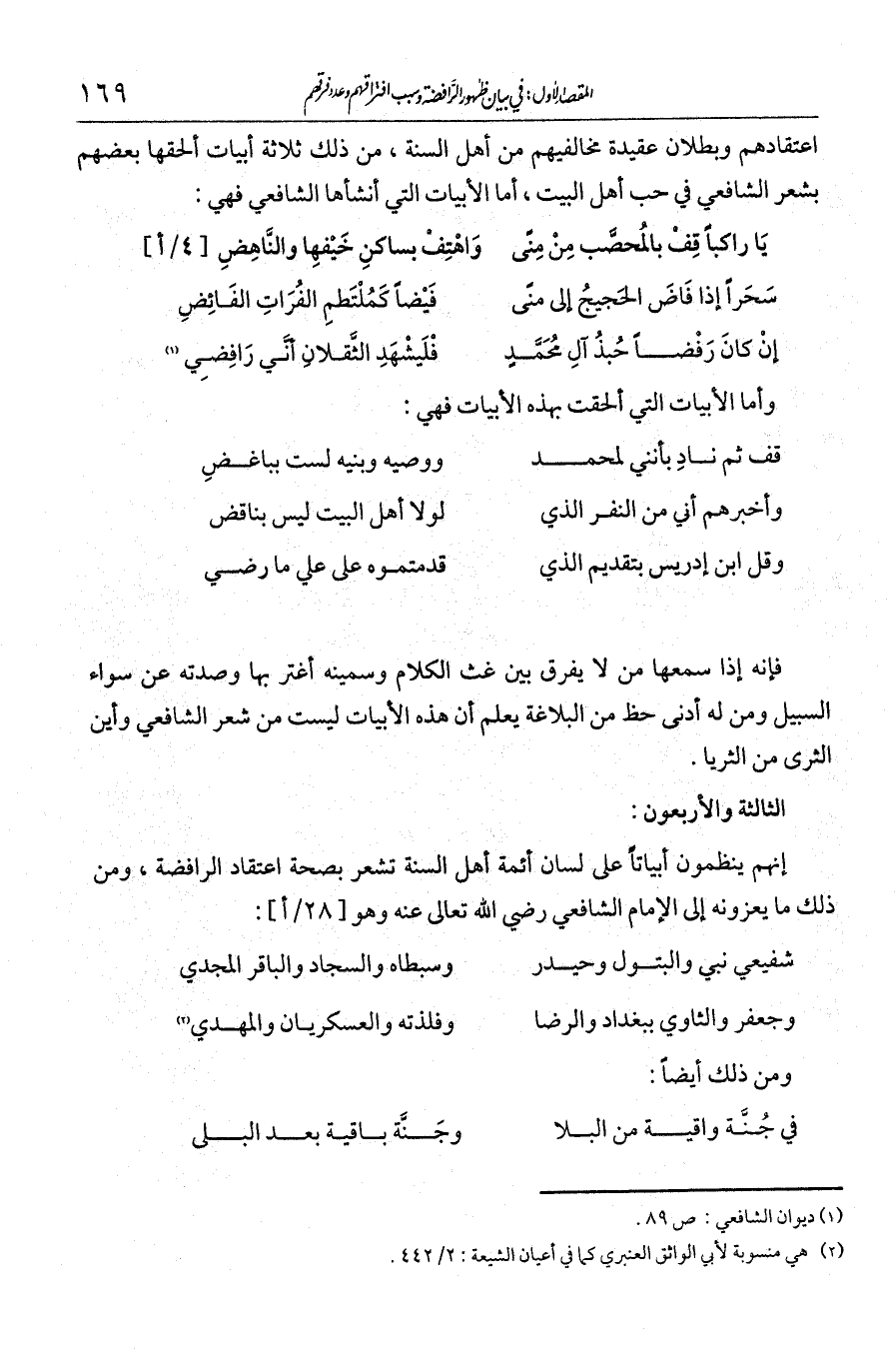 اعتقادهم وبطلان عقيدة مخالفيهم من أهل السنة. من ذلك ثلاثة أبيات ألحقها بعضهم بشعر الشافعي في حب أهل البيت، أما الأبيات التي أنشأها الشافعي فهي: