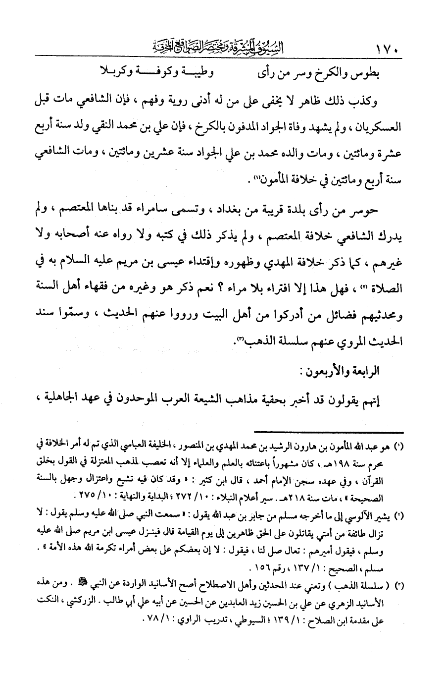وكذب ذلك ظاهر لا يخفى على من له أدنى روية وفهم، فإن الشافعي مات قبل العسكريين، ولم يشهد وفاة الجواد المدفون بالكرخ، فإن علي بن محمد النقي ولد سنة أربع عشرة ومائتين، ومات والده محمد بن علي الجواد سنة عشرين ومائتين، ومات الشافعي سنة أربع ومائتين في خلافة المأمون. وسر من رأى بلدة قريبة من بغداد، وتسمى سامراء، قد بناها المعتصم، ولم يدرك الشافعي خلافة المعتصم. ولم يذكر ذلك في كتبه ولا رواه عنه أصحابه ولا غيرهم، كما ذكر خلافة المهدي وظهوره واقتداء عيسى بن مريم عليه السلام به في الصلاة، فهل هذا إلا افتراء بلا مراء. نعم ذكر هو وغيره من فقهاء أهل السنة ومحدثيهم فضائل من أدركوا من أهل البيت ورووا عنهم الحديث، وسموا سند الحديث المروي عنهم سلسلة الذهب.
