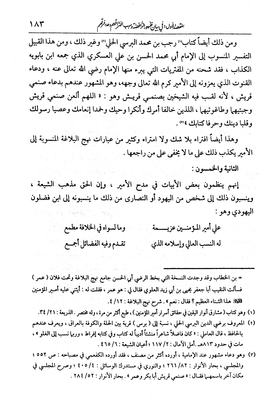 الثانية والخمسون: إنهم ينظمون بعض الأبيات في مدح الأمير، وأن الحق مذهب الشيعة، وينسبون ذلك إلى شخص من اليهود أو النصارى. من ذلك ما ينسبونه إلى ابن فضلون اليهودي وهو: