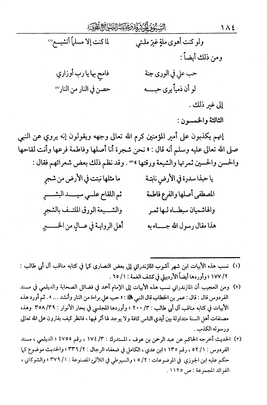 الثالثة والخمسون: إنهم يكذبون على أمير المؤمنين كرم الله تعالى وجهه ويقولون إنه يروي عن النبي - صلى الله عليه وسلم - أنه قال: "نحن شجرة أنا أصلها وفاطمة فرعها وأنت لقاحها والحسن والحسنين ثمرتها والشيعة ورقتها". وقد نظم ذلك بعض شعرائهم فقال: