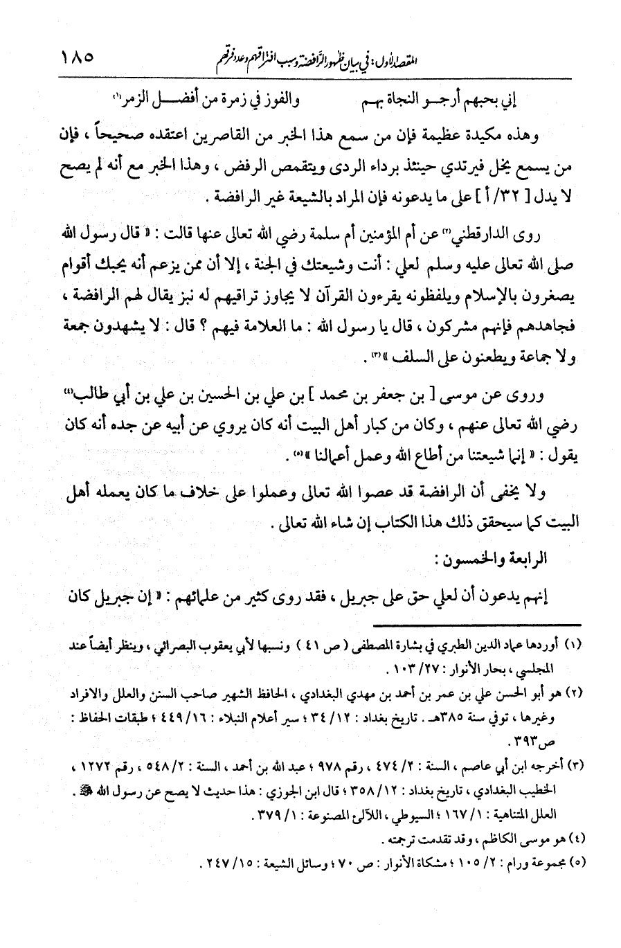وهذه مكيدة عظيمة، فإن من سمع هذا الخبر من القاصرين اعتقده صحيحا، فإن من يسمع يخل فيرتدي حينئذ برداء الردى ويتقمص الرفض. وهذا الخبر مع أنه لا يصح لا يدل على ما يدعونه، فإن المراد بالشيعة غير الرافضة. روى الدارقطني عن أم المؤمنين أم سلمة رضي الله تعالى عنها قالت: قال رسول الله - صلى الله عليه وسلم - لعلي: "أنت وشيعتك في الجنة، ألا إن ممن يزعم أنه يحبك أقوام يصغرون بالإسلام ويلفظونه يقرءون القران لا يجاوز تراقيهم له نبز يقال لهم الرافضة، فجاهدهم فإنهم مشركون، قال: يا رسول الله، ما العلامة فيهم؟ قال: لا يشهدون جمعة ولا جماعة ويطعنون على السلف". وروى عن موسى [بن جعفر بن محمد] بن علي بن الحسين بن علي بن أن طالب رضي الله تعالى عنهم، وكان من كبار أهل البيت، أنه كان يروي عن أبيه عن جده أنه كان يقول: "إنما شيعتنا من أطاع الله وعمل أعمالنا". ولا يخفى أن الرافضة قد عصوا الله تعالى وعملوا على خلاف ما كان يعمله أهل البيت كما سيحقق ذلك هذا الكتاب إن شاء الله تعالى.