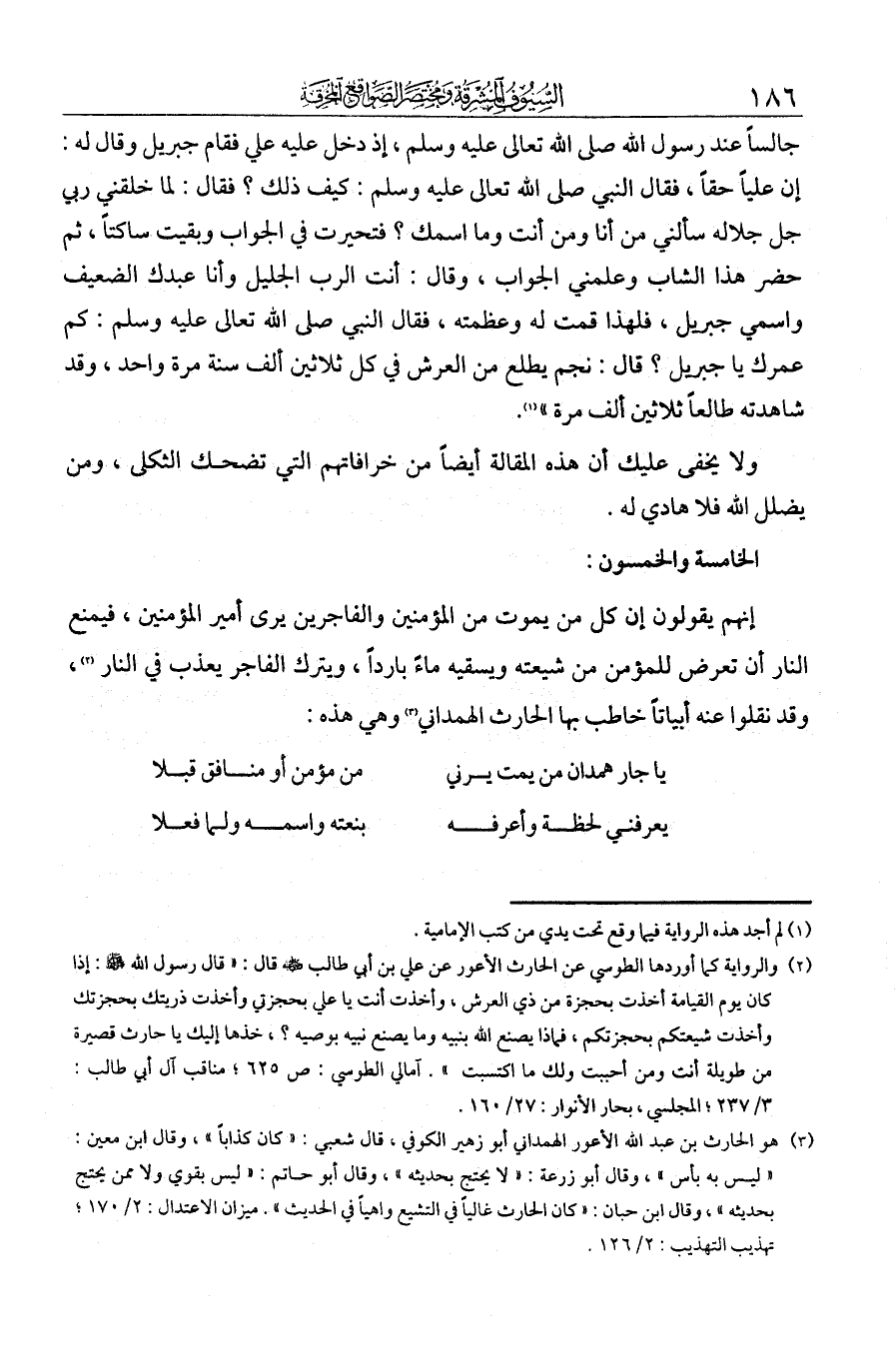 الخامسة والخمسون: إنهم يقولون إن كل من يموت من المؤمنين والفاجرين يرى أمير المؤمنين، فيمنع النار أن تعرض للمؤمن من شيعته ويسقيه ماء باردا ويترك الفاجر يعذب في النار. وقد نقلوا عنه أبياتا خاطب بها الحارث الهمداني، وهي هذه: