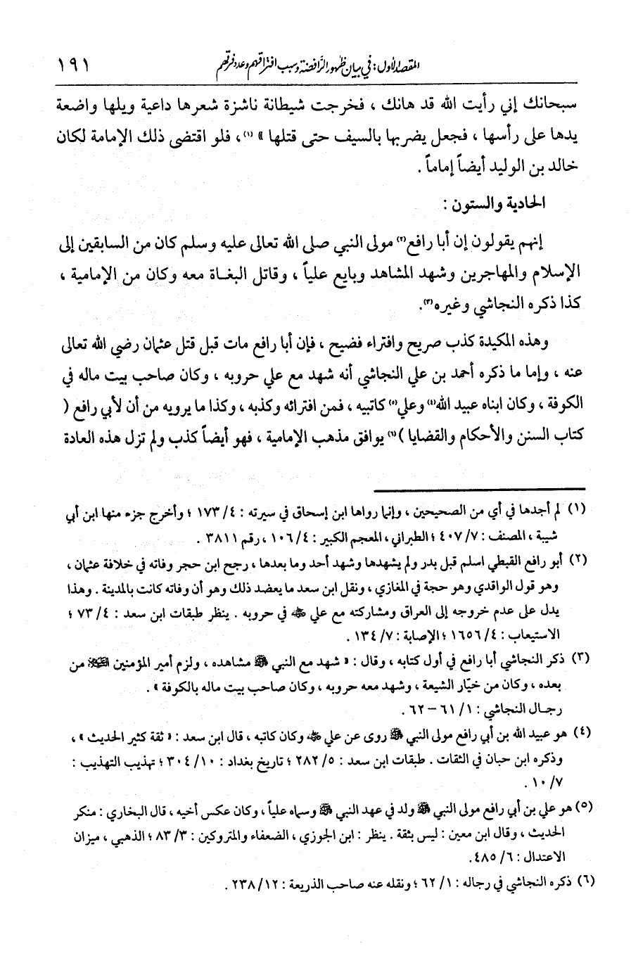الحادية والستون: إنهم يقولون إن أبا رافع مولى النبي - صلى الله عليه وسلم - كان من السابقين إلى الإسلام والمهاجرين وشهد المشاهد وبايع عليا وقاتل البغاة معه وكان من الإمامية، كذا ذكره النجاشي وغيره.