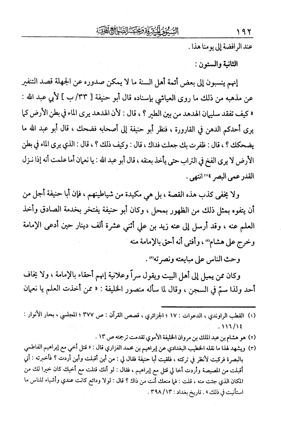 الثانية والستون: إنهم ينسبون إلى بعض أئمة أهل السنة ما لا يمكن صدوره عن الجهلة قصد التنفير عن مذهبه. من ذلك ما روى العياشي بإسناده: قال أبو حنيفة لأبي عبد الله: كيف تفقد سليمان الهدهد من بين الطير؟ قال: لأن الهدهد يرى الماء في بطن الأرض كما يرى أحدكم الدهن في القارورة، فنظر أبو حنيفة إلى أصحابه فضحك، قال أبو عبد الله ما يضحكك؟ قال: ظفرت بك جعلت فداك، قال: وكيف ذلك؟ قال: الذي يرى الماء في بطن الأرض لا يرى الفخ في التراب حتى يأخذ بعنقه، قال أبو عبد الله: يا نعمان أما علمت أنه إذا نزل القدر عمى البصر. انتهى.