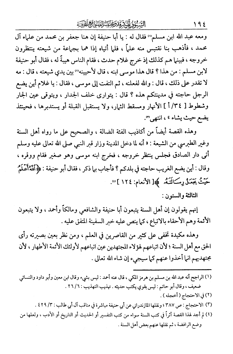 الثالثة والستون: إنهم يقولون إن أهل السنة يتبعون أبا حنيفة والشافعي ومالكا وأحمد ولا يتبعون الأئمة وهم الأحقاء بالاتباع، كما ينص عليه خبر السفينة المتفق عليه.