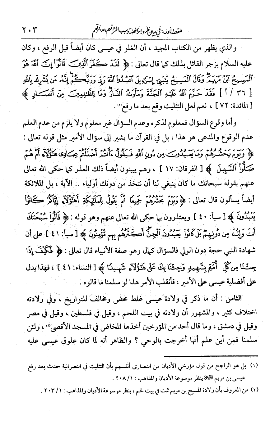 والذي يظهر من الكتاب المجيد أن الغلو في عيسى كان أيضا قبل الرفع، وكان عليه السلام يزجر القائل بذلك كما قال تعالى: {لَقَدْ كَفَرَ الَّذِينَ قَالُوا إِنَّ اللَّهَ هُوَ الْمَسِيحُ ابْنُ مَرْيَمَ وَقَالَ الْمَسِيحُ يَا بَنِي إِسْرَائِيلَ اعْبُدُوا اللَّهَ رَبِّي وَرَبَّكُمْ إِنَّهُ مَنْ يُشْرِكْ بِاللَّهِ فَقَدْ حَرَّمَ اللَّهُ عَلَيْهِ الْجَنَّةَ وَمَأْوَاهُ النَّارُ وَمَا لِلظَّالِمِينَ مِنْ أَنْصَارٍ}. نعم لعل التثليث وقع بعد ما رفع. وأما وقوع السؤال فمعلوم لذكره، وعدم السؤال غير معلوم، ولا يلزم من عدم العلم عدم الوقوع، والمدعى هو هذا. بل في القران ما يشير إلى سؤال الأمير مثل قوله تعالى: {وَيَوْمَ يَحْشُرُهُمْ وَمَا يَعْبُدُونَ مِنْ دُونِ اللَّهِ فَيَقُولُ أَأَنْتُمْ أَضْلَلْتُمْ عِبَادِي هَؤُلَاءِ أَمْ هُمْ ضَلُّوا السَّبِيلَ}، وهم يبينون أيضا ذلك العذر كما حكى الله تعالى عنهم بقوله: {سُبْحَانَكَ مَا كَانَ يَنْبَغِي لَنَا أَنْ نَتَّخِذَ مِنْ دُونِكَ مِنْ أَوْلِيَاءَ} الآية، بل الملائكة أيضا يسألون، قال تعالى: {وَيَوْمَ يَحْشُرُهُمْ جَمِيعًا ثُمَّ يَقُولُ لِلْمَلَائِكَةِ أَهَؤُلَاءِ إِيَّاكُمْ كَانُوا يَعْبُدُونَ} ويعتذرون بما حكى الله تعالى عنهم وهو قوله: {قَالُوا سُبْحَانَكَ أَنْتَ وَلِيُّنَا مِنْ دُونِهِمْ بَلْ كَانُوا يَعْبُدُونَ الْجِنَّ أَكْثَرُهُمْ بِهِمْ مُؤْمِنُون}. على أن شهادة النبي حجة دون الولي، فالسؤال كمال وهو صفة الأنبياء قال تعالى: {فَكَيْفَ إِذَا جِئْنَا مِنْ كُلِّ أُمَّةٍ بِشَهِيدٍ وَجِئْنَا بِكَ عَلَى هَؤُلَاءِ شَهِيدًا}، فهذا يدل على أفضلية عيسى على الأمير، فانقلب الأمر. هذا لو سلمنا ما قالوه.