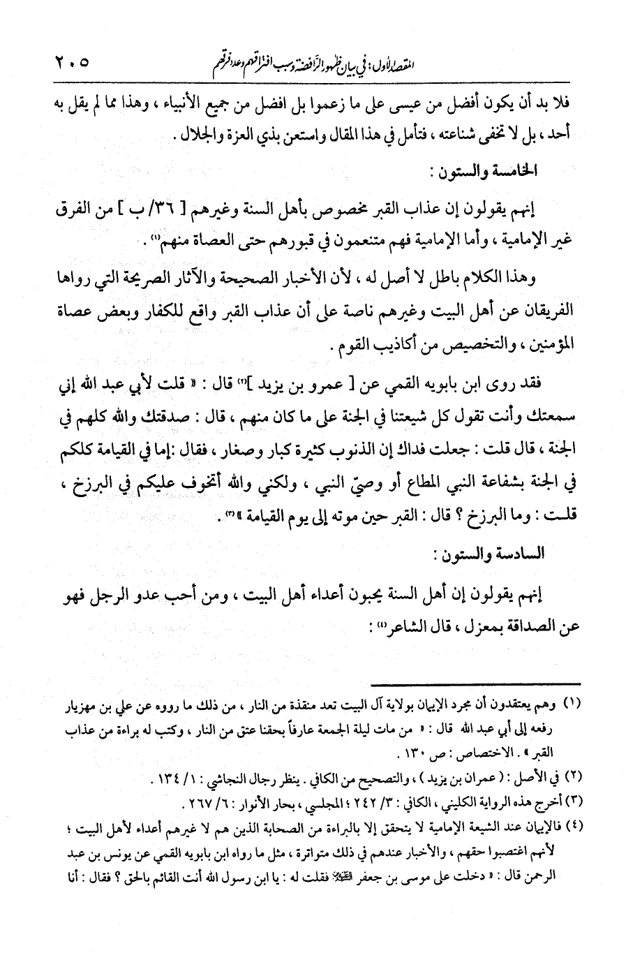وهذا الكلام باطل لا أصل له، لأن الأخبار الصحيحة والآثار الصريحة التي رواها الفريقان عن أهل البيت وغيرهم ناصة عام أن عذاب القبر واقع للكفار وبعض عصاة المؤمنين، والتخصيص من أكاذيب القوم. فقد روى ابن بابويه القمي عن [عمرو] بن يزيد قال: "قلت لأبي عبد الله إني سمعتك وأنت تقول: كل شيعتنا في الجنة على ما كان منهم، قال: صدقتك والله كلهم في الجنة، قال قلت: جعلت فداك إن الذنوب كثيرة كبار وصغار، فقال: إما في القيامة كلكم في الجنة بشفاعة النبي المطاع أو وصي النبي، ولكني والله أتخوف عليكم في البرزخ، قلت: وما البرزخ؟ قال: القبر حين موته إلى يوم القيامة.