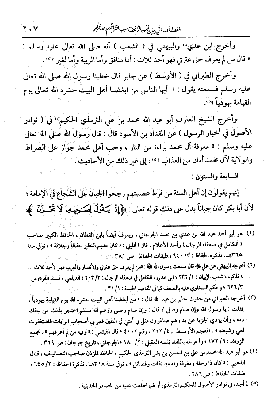 وأخرج ابن عدي والبيهقي في الشعب أنه - صلى الله عليه وسلم - قال: "من لم يعرف حق عترتي [والأنصار والعرب] فهو أحد ثلاثة: إما منافق وإما لزنية وإما لغير طهور". (¬1) وأخرج الطبراني في الأوسط عن جابر قال: خطبنا رسول الله - صلى الله عليه وسلم - فسمعته يقول: "أيها الناس من أبغضنا أهل البيت حشره الله تعالى يوم القيامة يهوديا". (¬2) وأخرج الشيخ العارف أبو عبد الله محمد بن علي الترمذي الحكيم في نوادر الأصول في أخبار الرسول عن المقداد بن الأسود قال: قال رسول الله - صلى الله عليه وسلم -: معرفة آل محمد براءة من النار، وحب أهل محمد جواز على الصراط، والولاية لآل محمد أمان من العذاب". (¬3) إلى غير ذلك من الأحاديث.