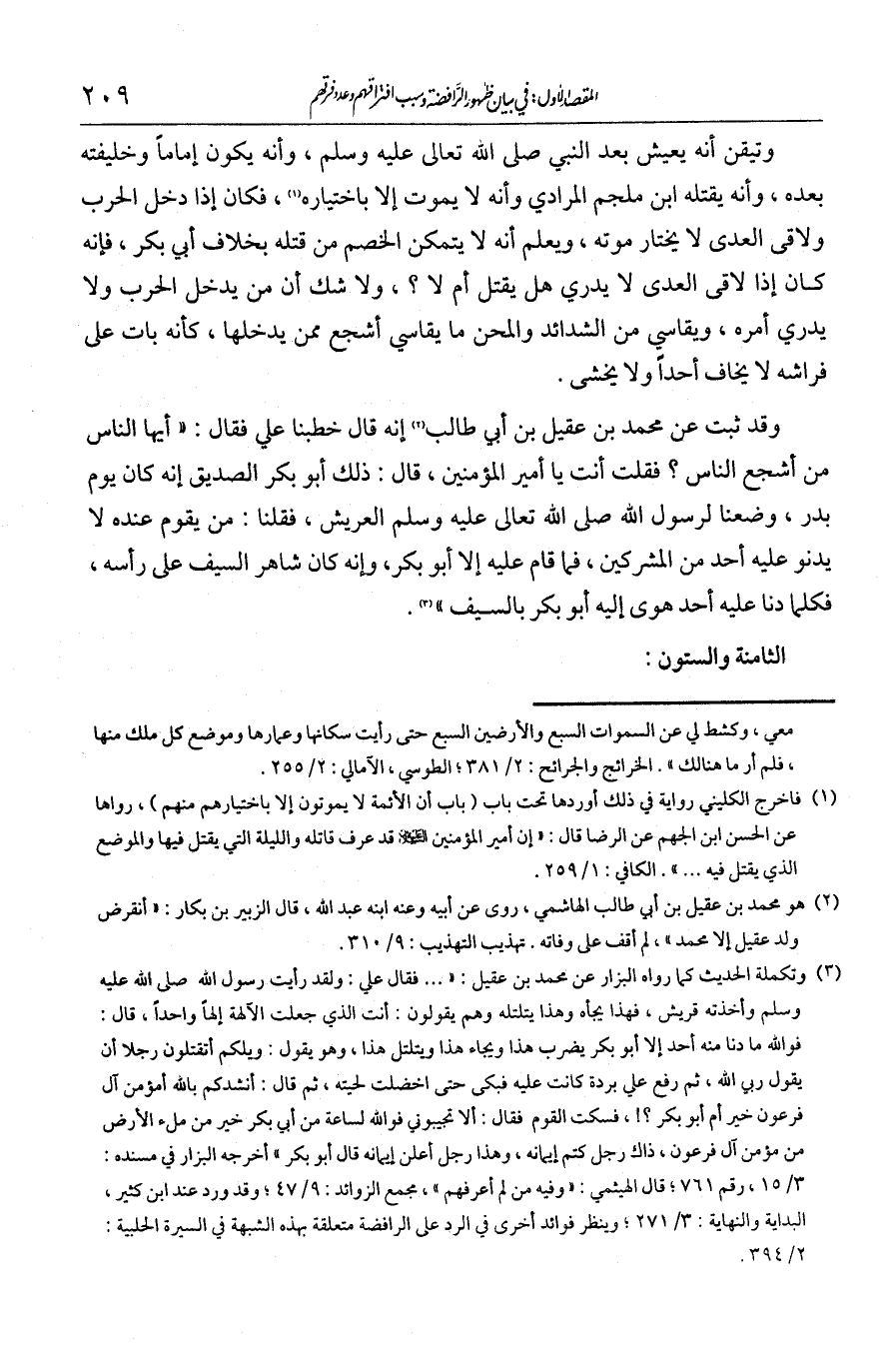 وتيقن أنه يعيش بعد النبي - صلى الله عليه وسلم -، وأنه يكون خليفته بعده، وأنه يقتله ابن ملجم المرادي، وأنه لا يموت إلا باختياره، فكان إذا دخل الحرب ولاقى العدو لا يختار موته ويعلم أنه لا يتمكن الخصم من قتله؛ بخلاف أبي بكر، فإنه كان إذا لاقى العدى لا يدري هل يقتل أم لا. ولا شك أن من يدخل الحرب ولا يدري أمره ويقاسي من الشدائد والمحن ما يقاسي أشجع ممن يدخلها كأنه بات على فراشه لا يخاف أحدا ولا يخشى. وقد ثبت عن محمد بن عقيل بن أبي طالب أنه قال خطبنا علي فقال: "أيها الناس من أشجع الناس؟ فقلت أنت يا أمير المؤمنين، قال: ذلك أبو بكر الصديق، إنه كان يوم بدر وضعنا لرسول الله - صلى الله عليه وسلم - العريش فقلنا: من يقوم عنده لا يدنو عليه أحد من المشركين، فما قام عليه إلا أبو بكر وإنه كان شاهر السيف على رأسه، فكلما دنا عليه أحد هوى إليه أبو بكر بالسيف.