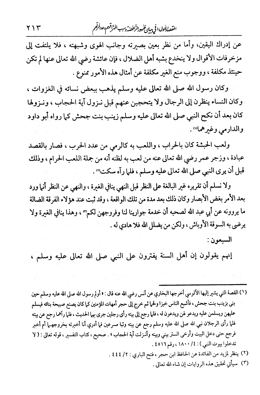 عن إدراك اليقين، وأما من نظر بعين بصيرته وجانب الهوى وشبهته فلا يلتفت إلى مزخرفات الأقوال ولا ينخدع بشبه أهل الضلال. فإن عائشة رضي الله تعالى عنها لم تكن حينئذ مكلفة، ووجوب منع الغير مكلفة عن أمثال هذه الأمور ممنوع. وكان رسول الله - صلى الله عليه وسلم - يذهب ببعض نسائه في الغزوات، وكان النساء ينظرن إلى الرجال ولا يتحجبن عنهم قبل نزول آية الحجاب. ونزولها كان بعد أن نكح النبي - صلى الله عليه وسلم - زينب بنت جحش كما رواه أبو داود والدارمي وغيرهما. ولعب الحبشة كان بالحراب، واللعب به كالرمي من عدد الحرب، فصار بالقصد عبادة. وزجر عمر رضي الله تعالى عنه من لعب به لظنه أنه من جملة اللعب الحرام، وذلك قبل أن يرى النبي - صلى الله عليه وسلم -، فلما رآه سكت. ولا نسلم أن تقريره غير البالغة على النظر قبل النهي ينافي الغيرة، والنهي عن النظر إنما ورد بعد الأمر بغض الأبصار، وكان ذلك بعد مدة من تلك الواقعة. وقد ثبت عند هؤلاء الفرقة الضالة ما يروونه عن أبي عبد الله لصحبه أن "خدمة جوارينا لنا وفروجهن لكم". وهذا ينافي الغيرة ولا يرضى به السوقة الأوباش، ولكن من يضلل الله فلا هادي له.