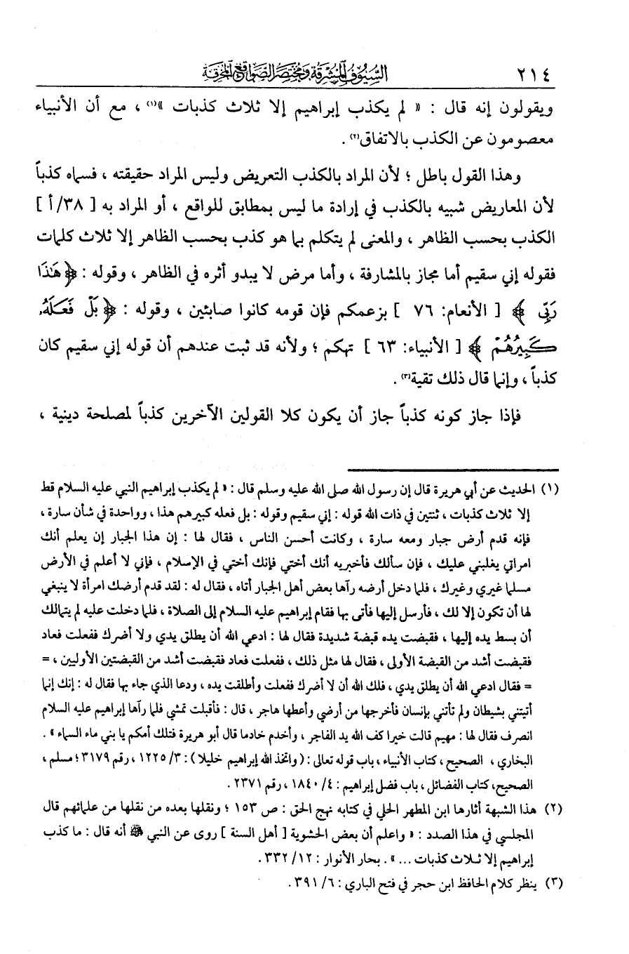 ويقولون إنه قال: "لم يكذب إبراهيم إلا ثلاث كذبات"، مع أن الأنبياء معصومون عن الكذب بالاتفاق.