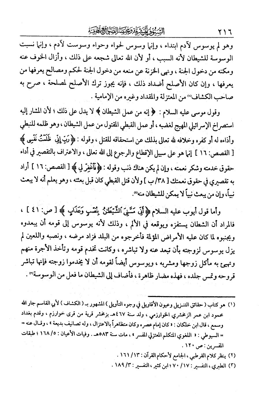 وهو لم يوسوس لآدم ابتداء، وإنما وسوس لحواء وحواء وسوست لآدم؛ وإنما نسبت الوسوسة للشيطان لأنه السبب، أو لأن الله تعالى شجعه على ذلك وأزال الخوف عنه ومكنه من دخول الجنة ونهى الخزنة عن منعه من دخول الجنة لحكم ومصالح يعرفها من يعرفها، وإن كان الأصلح أضداد ذلك، فإنه يجوز ترك الأصلح لمصلحة، صرح به صاحب الكشاف من المعتزلة والمقداد وغيره من الإمامية. وقول موسى عليه السلام إنه {مِنْ عَمَلِ الشَّيْطَانِ} لا يدل على ذلك، لأن المشار إليه استصراخ الإسرائيلي المهيج لغضبه، أو عمل القبطي المقتول من عمل الشيطان، وهو ظلمه للقبطي وإيذاؤه له أو كفره وخلافه لله تعالى بذلك عن استحقاقه للقتل. وقوله: {رَبِّ إِنِّي ظَلَمْتُ نَفْسِي} إنما هو على سبيل الانقطاع والرجوع إلى الله تعالى والاعتراف بالتقصير في أداء حقوق خدمته وشكر نعمته وإن لم يكن هناك ذنب. وقوله: {فَاغْفِرْ لِي} أراد به تقصيري في حقوق نعمتك. ولأن قتل القبطي كان قبل بعثته وهو [لا] يعلم أنه يبعث نبيا. وأن من يبعث نبيا لا يمكن للشيطان منه. وأما قول أيوب عليه السلام: {أَنِّي مَسَّنِيَ الشَّيْطَانُ بِنُصْبٍ وَعَذَابٍ} فالمراد أن الشيطان يستفزه ويوقعه في الألم، وذلك لأنه يوسوس إلى قومه أن يبعدوه ويجنبوه لما كان عليه الأمراض المؤلمة فأخرجوه من البلد فزاد مرضه ونصبه، واللعين لم يزل يوسوس لزوجته بأن تبعد عنه ولا تباشره، وكانت تخدم قومه وتأخذ الأجرة منهم وتهيئ به مأكل زوجها ومشربه، ويوسوس أيضا لقومه أن لا يخدموا زوجته فإنها تباشر قروحه وتمس جلده، فهذه مضار ظاهرة، فأضاف إلى الشيطان ما فعل من الوسوسة.