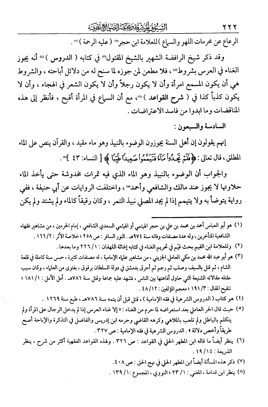 الرعاع عن محرمات اللهو والسماعة للعلامة ابن حجر (عليه الرحمة). وقد ذكر شيخ الرافضة الشهير بالشيخ المقتول في كتابه الدروس أنه يجوز الغناء في العرس بشروط، فلا مطعن لمن جوزه لما سنح له من دلائل إباحته، والشروط هي أن يكون المسمع امرأة وأن لا يكون رجلا وأن لا يكون الشعر في الهجاء وأن لا يكون كذبا، كذا في شرح القواعد. مع أن السماع من المرأة أقبح. فانظر إلى هذه المناقضات وما أبدوا من فاسد الاعتراضات.