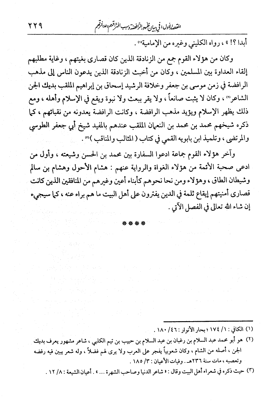 وكان من أخبث الزنادقة الذين يدعون الناس إلى مذهب الرافضة في زمن موسى بن جعفر وخلافة الرشيد إسحاق بن إبراهيم الملقب بديك الجن الشاعر، وكان لا يثبت صانعا ولا يقر ببعث ولا نبوة ويقع في الإسلام وأهله، ومع ذلك يظهر الإسلام ويؤيد مذهب الرافضة، وكانت الرافضة يعدونه من نقبائهم، كما ذكره شيخهم محمد بن محمد بن النعمان الملقب عندهم بالمفيد شيخ أبي جعفر الطوسي والمرتضى وتلميذ ابن بابويه القمي في كتاب المثالب والمناقب. وآخر هؤلاء القوم جماعة ادعوا السفارة بين محمد بن الحسن وشيعته، وأول من ادعى صحبة الأئمة من هؤلاء الغواة والرواية عنهم: هشام الأحول وهشام بن سالم وشيطان الطاق، وهؤلاء ومن نحا نحوهم كأبناء أعين وغيرهم من المنافقين الذين كانت قصارى أمنيتهم إيقاع ثلمة في الدين يفترون على أهل البيت ما هم براء عنه، كما سيجيء إن شاء الله تعالى في الفصل الآتي.
