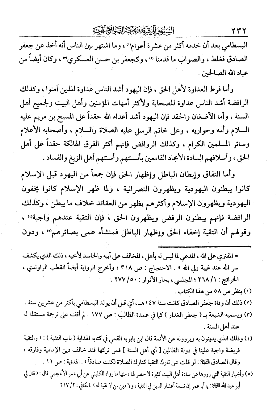 وأما النفاق وإبطان الباطل وإظهار الحق: فإن جمعا من اليهود قبل الإسلام كانوا يبطنون اليهودية ويظهرون النصرانية، ولما ظهر الإسلام كانوا يخفون اليهودية ويظهرون الإسلام، وأكثرهم يظهر من العقائد خلاف ما يبطن. وكذلك الرافضة، فإنهم يبطنون الرفض ويظهرون الحق، فإن التقية عندهم واجبة، وقولهم إن التقية إخفاء الحق وإظهار الباطل، فمنشؤه عمى بصائرهم، ودون