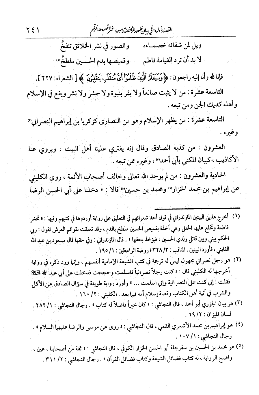 الحادية والعشرون: من لم يوحد الله تعالى، وخالف الأئمة في العقيدة، كهشام بن سالم والميثمي وصاحب الطاق وغيرهم ممن ادعى أنه من خلص أصحاب الأئمة. روى الكليني عن إبراهيم بن محمد الخراز ومحمد بن حسين قالا: دخلنا على أبي الحسن الرضا