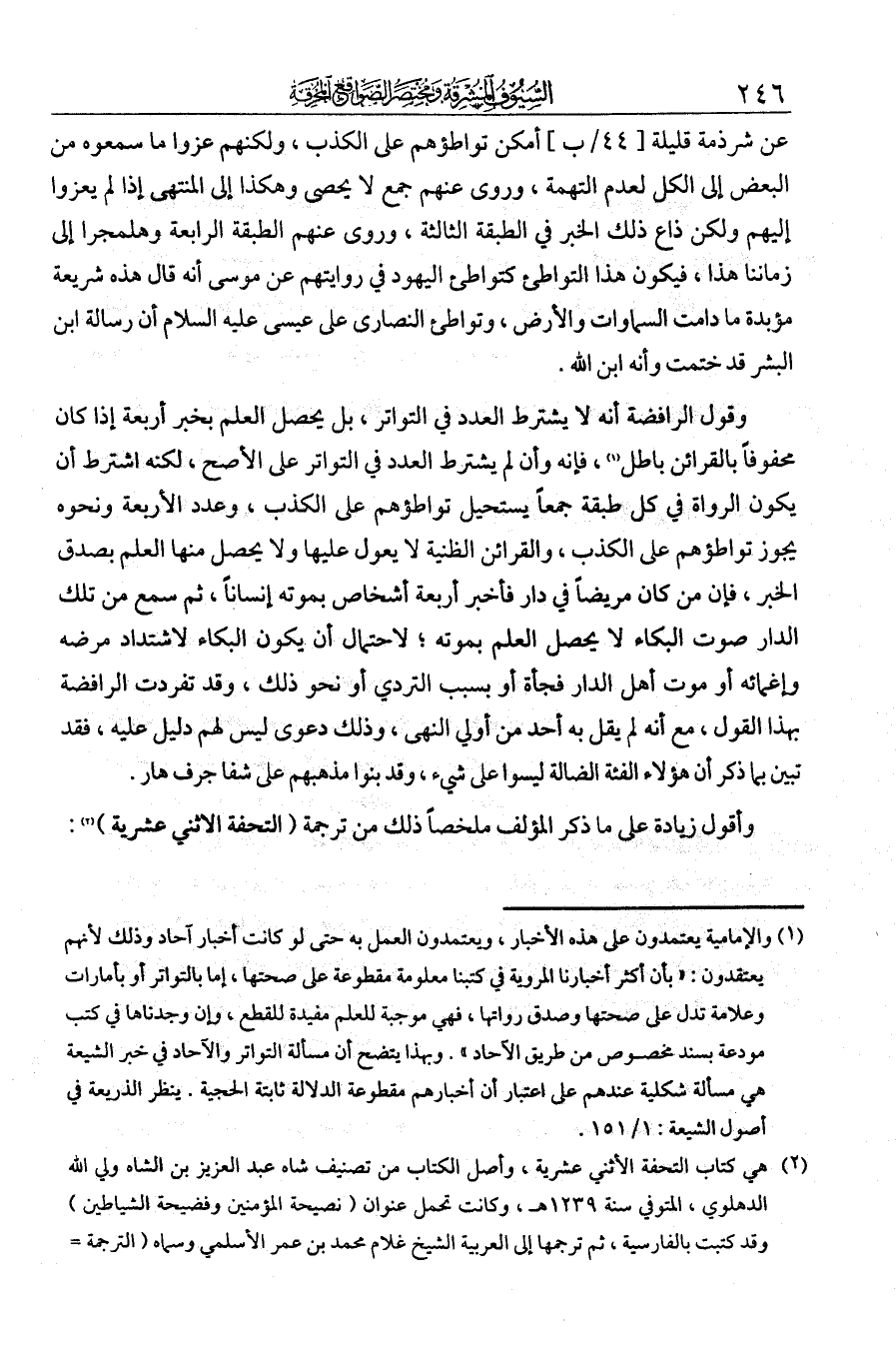 عن شرذمة قليلة أمكن تواطؤهم على الكذب، ولكنهم عزوا ما سمعوه من البعض إلى الكل لعدم التهمة، وروى عنهم جمع لا يحصى، وهكذا إلى المنتهى، إذ لم يعزو إليهم، ولكن ذاع ذلك الخبر في الطبقة الثالثة، وروى عنهم الطبقة الرابعة، وهلم جرا إلى زماننا هذا، فيكون هذا التواطؤ كتواطئ اليهود في روايتهم عن موسى أنه قال: "هذه شريعة مؤبدة ما دامت السماوات والأرض"، وتواطىء النصارى عن عيسى عليه السلام أن رسالة ابن البشر قد ختمت قبل وأنه ابن الله.
