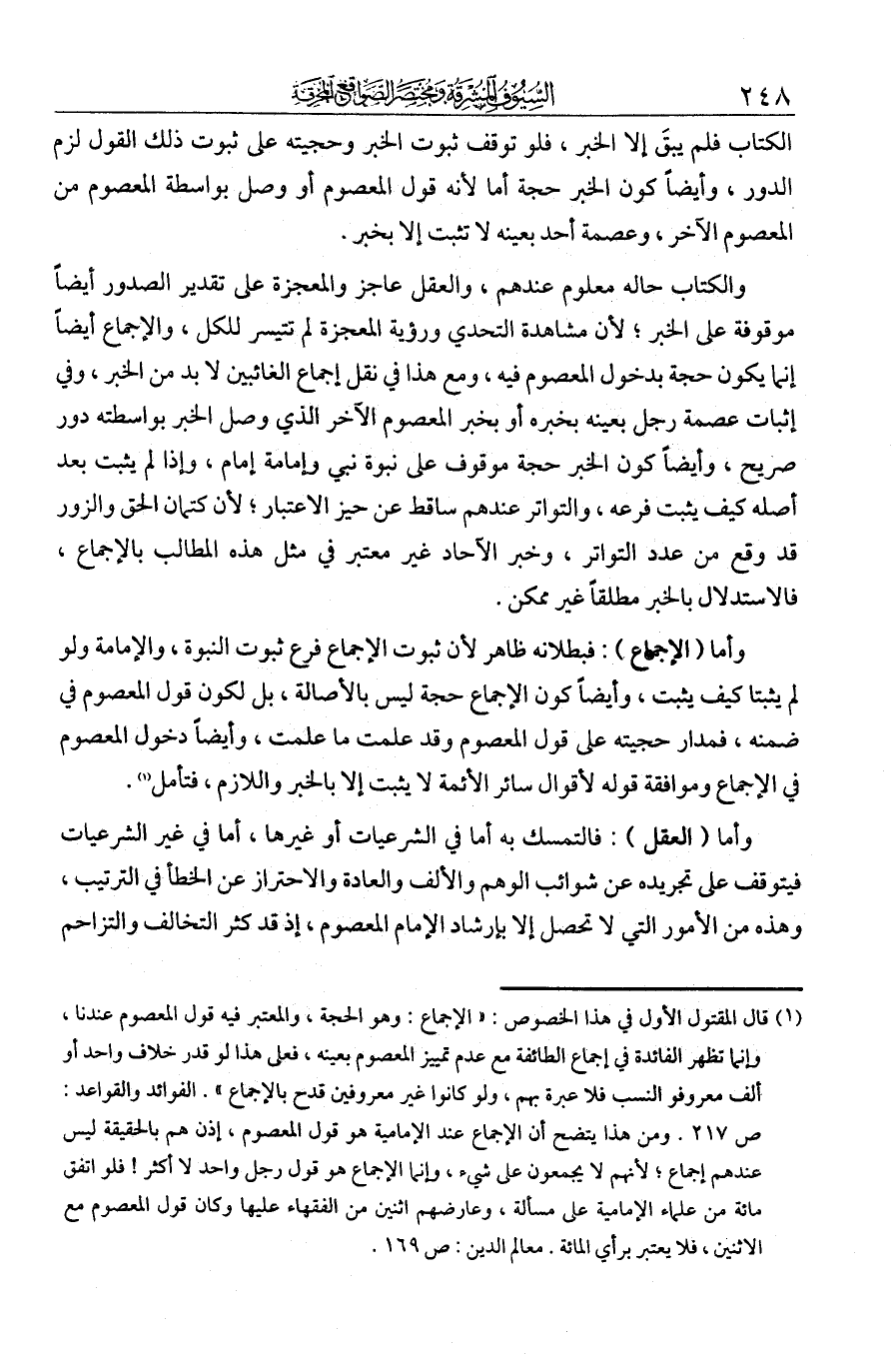 الكتاب، فلم يبق إلا الخبر. فلو توقف ثبوت الخبر وحجيته على ثبوت ذلك القول لزم الدور. وأيضا كون الخبر حجة، إما لأنه قول المعصوم، أو وصل بواسطة المعصوم من المعصوم الآخر؛ وعصمة أحد بعينه لا تثبت إلا بخبر، والكتاب حاله معلوم عندهم، والعقل عاجز، والمعجزة على تقدير الصدور أيضا موقوفة على الخبر، لأن مشاهدة التحدي ورؤية المعجزة لم تتيسر لكل. والإجماع أيضا إنما يكون حجة بدخول المعصوم فيه، ومع هذا في نقل إجماع الغائبين لا بد من الخبر. وفي إثبات عصمة رجل بعينه بخبره، أو بخبر المعصوم الآخر الذي وصل الخبر بواسطته دور صريح. وأيضا كون الخبر حجة موقوف على نبوة نبي وإمامة إمام، وإذا لم يثبت بعد أصله كيف يثبت فرعه. والتواتر عندهم ساقط عن حيز الاعتبار، لأن كتمان الحق والزور قد وقع من عدد التواتر، وخبر الآحاد غير معتبر في مثل هذه المطالب بالإجماع، فالاستدلال بالخبر مطلقا غير ممكن.