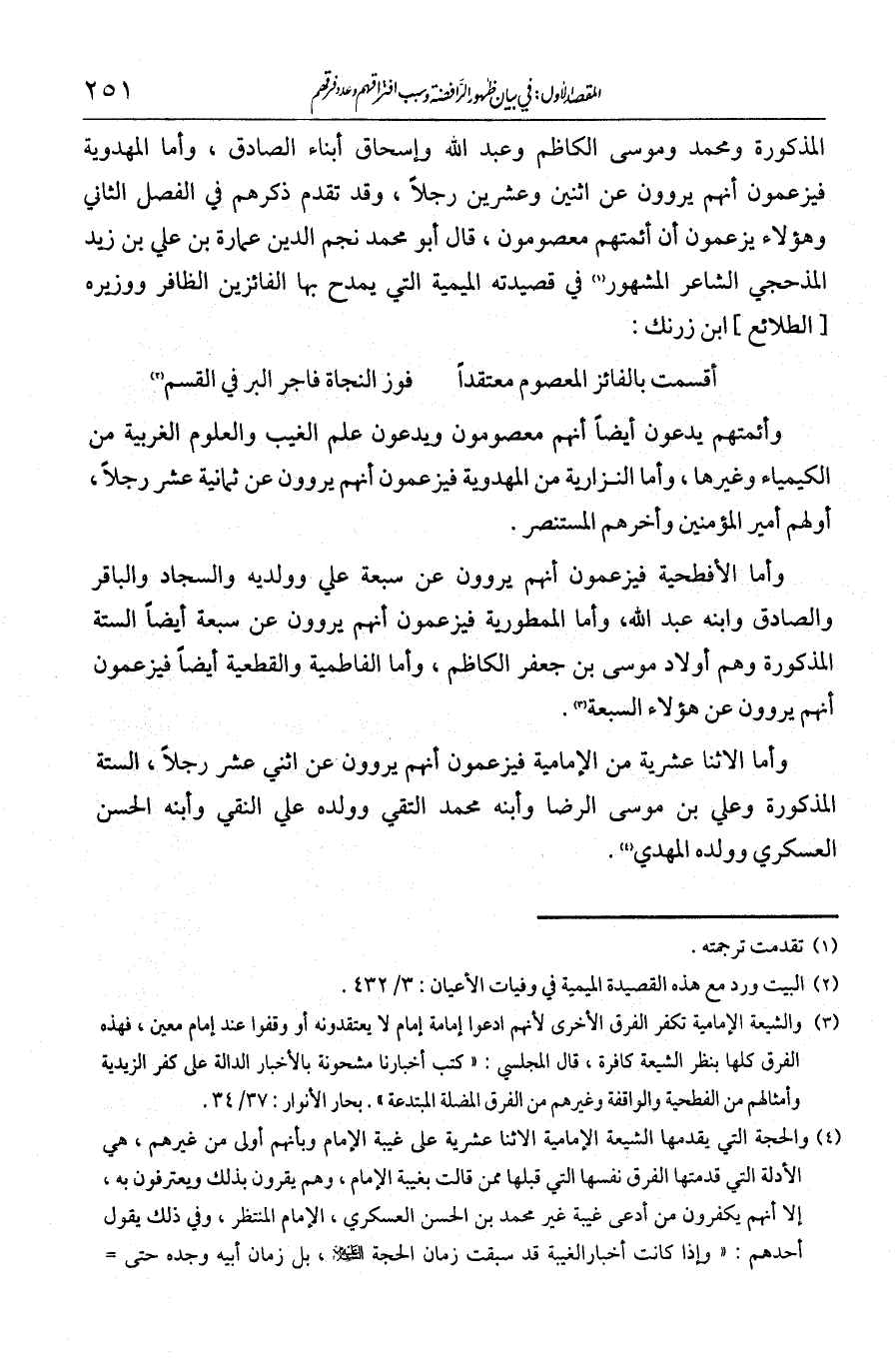 وأما المهدوية فيزعمون أنهم يروون عن اثنين وعشرين رجلا. وقد تقدم ذكرهم في الفصل الثاني. وهؤلاء يزعمون أن أئمتهم معصومون. قال أبو محمد نجم الدين عمارة بن علي بن زيد المدحجي الشاعر المشهور في قصيدته الميمية التي يمدح بها الفائز بن الظافر ووزيره [الطلائع] بن زرنك: