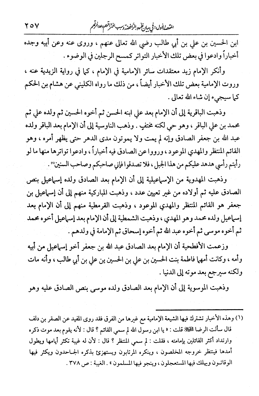 بن الحسين بن علي بن أبي طالب -رضي الله تعالى عنهم- وروى عنه وعن أبيه وجده أخبارا. وادعوا في بعض تلك الأخبار التواتر، كمسح الرجلين في الوضوء. وأنكر الإمام زيد معتقدات سائر الإمامية في الإمام، كما في رواية الزيدية عنه. وروت الإمامية بعض تلك الأخبار أيضا. من ذلك ما رواه الكليني عن هشام بن الحكم، كما سيجيء إن شاء الله تعالى.