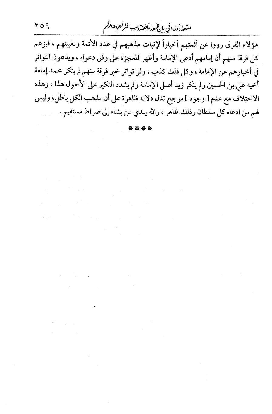 من هؤلاء الفرق رووا عن أئمتهم أخبارا لإثبات مذهبهم في عدد الأئمة وتعيينهم. فيزعم كل فرقة منهم أن إمامهم ادعى الإمامة وأظهر المعجزة على وفق دعواه. ويدعون التواتر في أخبارهم عن الإمامة. وكل ذلك كذب. ولو تواتر خبر فرقة منهم، لم ينكر محمد [بن] علي إمامة ابن أخيه علي بن الحسين، ولم ينكر زيد أصل الإمامة، ولم يشدد النكير على الأحول هذا. وهذه الاختلافات مع عدم مرجح تدل دلالة ظاهرة على أن مذهب الكل باطل، وليس لهم على من ادعاه كل سلطان. وذلك ظاهر. والله يهدي من يشاء إلى صراط مستقيم.