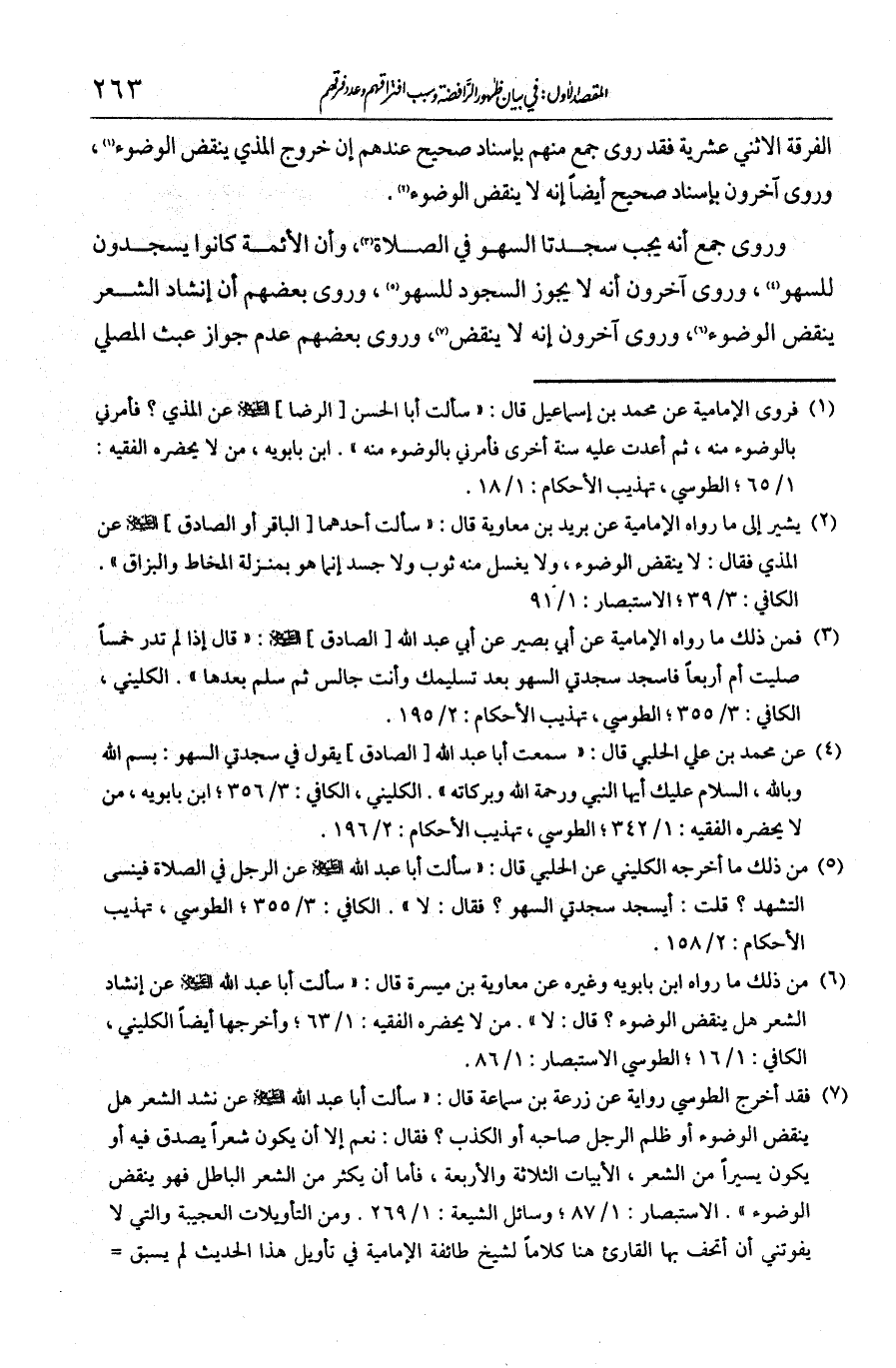 الفرقة الاثني عشرية: فقد روى جمع منهم بإسناد صحيح عندهم أن خروج المذي ينقض الوضوء، وروى آخرون بإسناد صحيح أيضا أنه لا ينقض الوضوء. وروى جمع أنه يجب سجدتا السهو في الصلاة، وأن الأئمة كانوا يسجدون للسهو، وروى آخرون أنه لا يجوز السجود للسهو. وروى بعضهم أن إنشاد الشعر ينقض الوضوء، وروى آخرون أنه لا ينقض. وروى بعضهم عدم جواز عبث المصلي