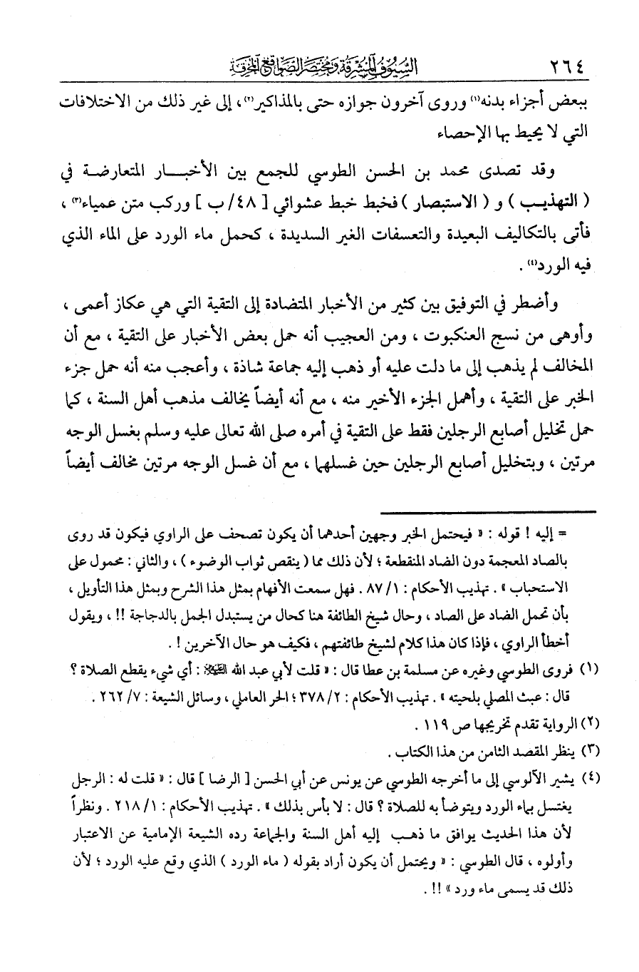 وقد تصدى محمد بن الحسن الطوسي للجمع بين الأخبار المتعارضة في التهذيب والاستبصار، فخبط خبط عشواء وركب متن عمياء، فأتى بالتكلفات البعيدة والتعسفات الغير السديدة، كحمل ماء الورد على الماء الذي فيه الورد. واضطر في التوفيق بين كثير من الأخبار المتضادة إلى التقية، التي هي عكاز أعمى وأوهى من نسج العنكبوت. ومن العجيب أنه حمل بعض الأخبار على التقية، مع أن المخالف لم يذهب إلى ما دلت عليه أو ذهب إليه جماعة شاذة! وأعجب منه أنه حمل جزء الخبر على التقية، وأهمل الجزء الآخر منه مع أنه أيضا يخالف مذهب أهل السنة! كما حمل تخليل أصابع الرجلين فقط على التقية في أمره - صلى الله عليه وسلم - بغسل الوجه مرتين وبتخليل أصابع الرجلين حين غسلهما، مع أن غسل الوجه مرتين مخالف أيضا