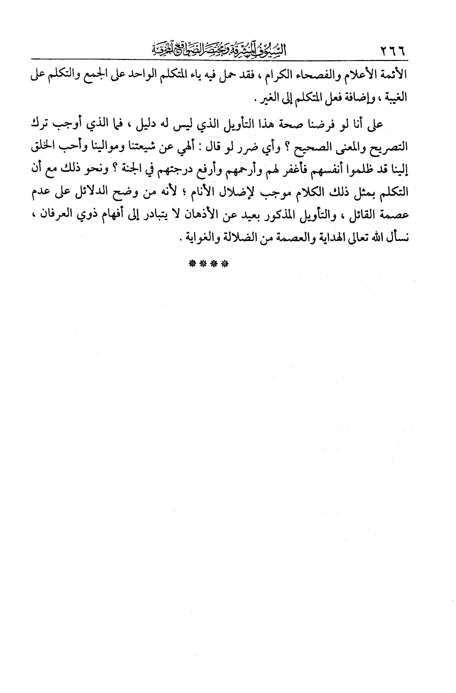 الأئمة الأعلام والفصحاء الكرام، فقد حمل فيه ياء المتكلم الواحد على الجمع، والتكلم على الغيبة، وإضافة فعل المتكلم إلى الغير. على أنا لو فرضنا صحة هذا التأويل الذي ليس له دليل؛ فما الذي أوجب ترك التصريح والمعنى الصحيح؟ وأي ضرر لو قال: إلهي إن شيعتنا وموالينا وأحب الخلق إلينا قد ظلموا أنفسهم، فاغفر لهم وارحمهم، وارفع درجتهم في الجنة، ونحو ذلك؟ مع أن التكلم بمثل ذلك الكلام موجب لإضلال الأنام؛ لأنه من أوضح الدلائل على عدم عصمة القائل. والتأويل المذكور بعيد عن الأذهان، لا يتبادر إلى أفهام ذوي العرفان. نسأل الله تعالى الهداية والعصمة من الضلالة والغواية.