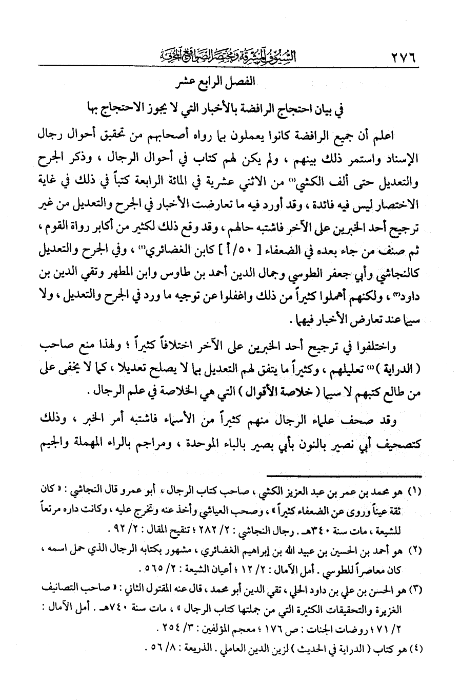 اعلم أن جميع فرق الرافضة كانوا يعملون بما رواه أصحابهم من تحقيق أحوال رجال الإسناد، واستمر ذلك بينهم، ولم يكن لهم كتاب في أحوال الرجال وذكر الجرح والتعديل، حتى ألف الكشي من الاثني عشرية في المائة الرابعة كتابا في ذلك في غاية الاختصار، ليس فيه فائدة. وقد أورد فيه ما تعارضت الأخبار في الجرح والتعديل من غير ترجيح أحد الخبرين على الآخر، فاشتبه حالهم، وقد وقع ذلك لكثير من أكابر رواة القوم.