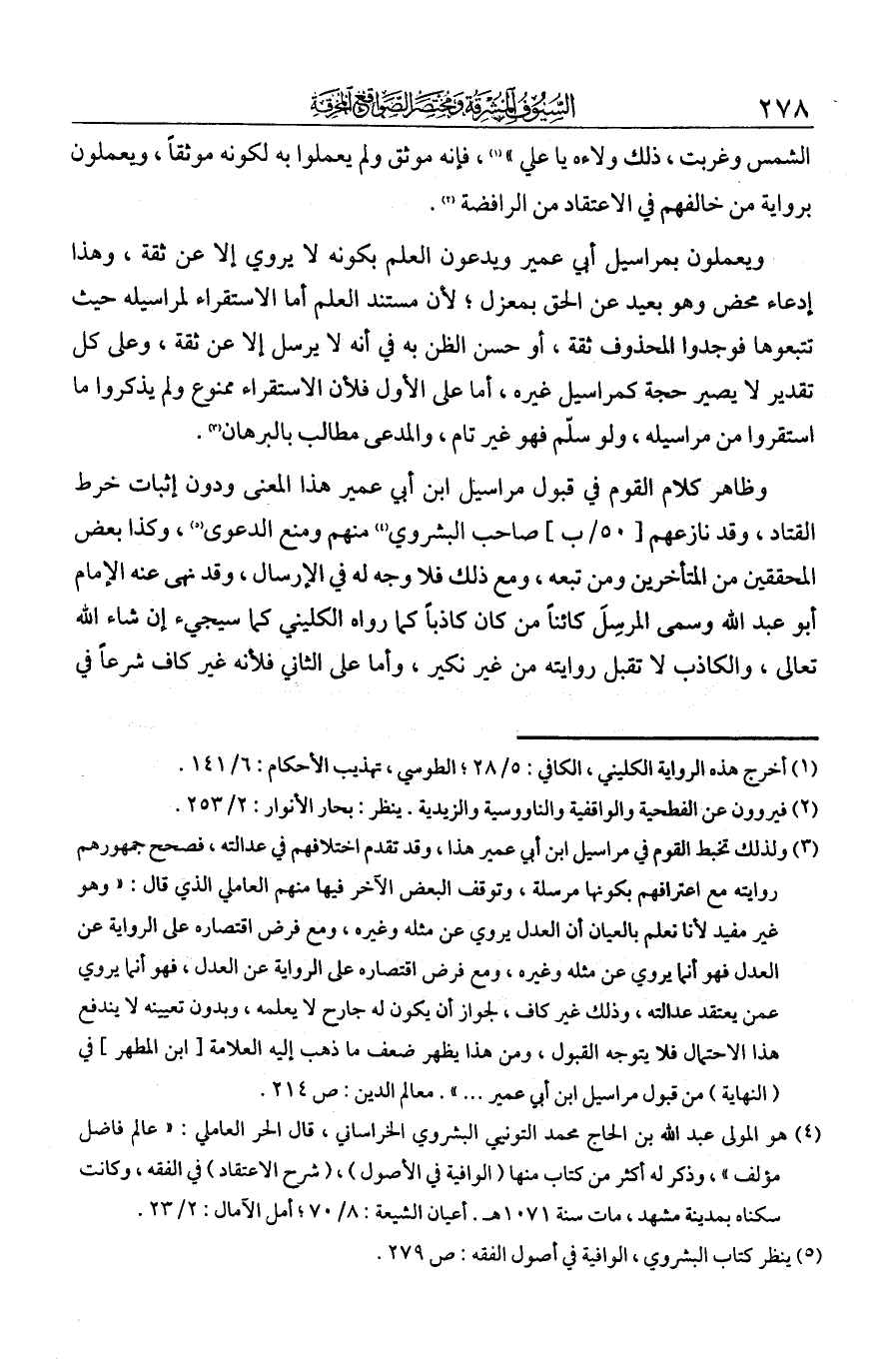 الشمس وغربت، ولك ولاءه يا علي"، فإنه موثق ولم يعملوا به لكونه موثقا. ويعملون برواية من خالفهم في الاعتقاد من الرافضة. ويعملون بمراسيل ابن عمير، ويدعون العلم بكونه لا يروي إلا عن ثقة، وهذا ادعاء محض وهو بعيد عن الحق بمعزل؛ لأن مستند العلم إما الاستقراء لمراسيله، حيث تتبعوها فوجدوا المحذوف ثقة، أو حسن الظن في أنه لا يرسل إلا عن ثقة، وعلى كل تقدير لا يصير حجة كمراسيل غيره؛ أما على الأول فلأن الاستقراء ممنوع، ولم يذكروا ما استقرؤا من مراسيله، ولو سلم فهو غير تام، والمدعي مطالب بالبرهان، وظاهر كلام القوم في قبول مراسيل ابن أبي عمير هذا المعنى، ودون إثباته خرط القتاد. وقد نازعهم صاحب البشرى منهم ومنع الدعوى، وكذا بعض المحققين من المتأخرين ومن تبعه. ومع ذلك فلا وجه له في الإرسال وقد نهى عنه الإمام أبو عبد الله وسمى المرسل كائنا من كان كاذبا، كما رواه الكليني - كما سيجيء إن شاء الله تعالى - والكاذب لا تقبل روايته من غير نكير. وأما على الثاني فلأنه غير كاف شرعا في