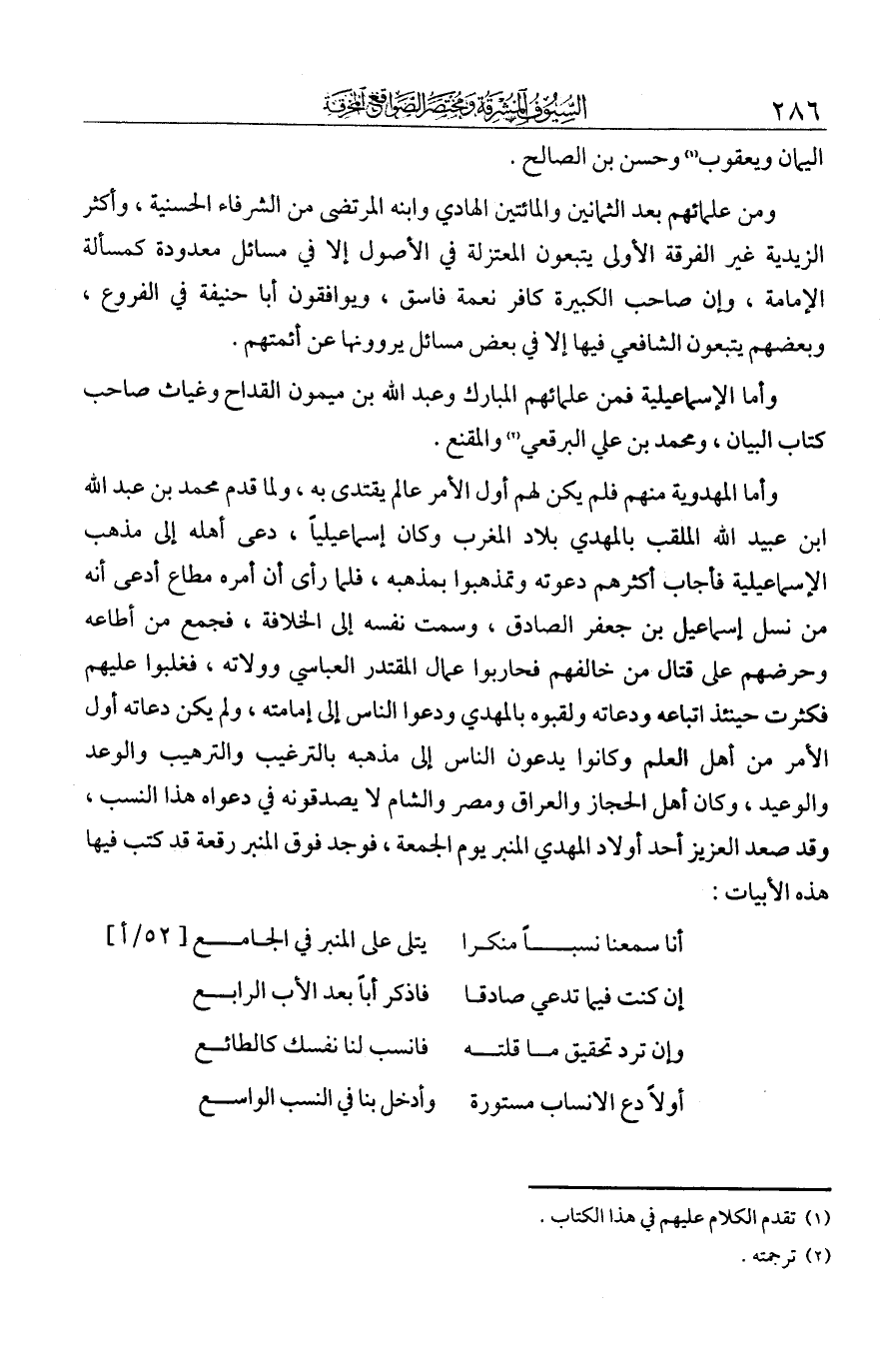 وأما المهدوية منهم فلم يكن لهم أول الأمر عالم يقتدى به، ولما قدم محمد بن عبد الله بن عبيد الله الملقب بالمهدي بلاد المغرب، وكان إسماعيليا دعا أهله إلى مذهب الإسماعيلية فأجاب أكثرهم دعوته وتمذهبوا بمذهبه، فلما رأى أن أمره مطاع ادعى أنه من نسل إسماعيل بن جعفر بن محمد الصادق وسمت نفسه إلى الخلافة فجمع من أطاعه وحرضهم على قتال من خالفهم، فحاربوا عمال المقتدر العباسي وولاته، فغلبوا عليهم، فكثرت حينئذ أتباعه ودعاته ولقبوه بالمهدي ودعوا الناس إلى إمامته. ولم يكن دعاته أول الأمر من أهل العلم، كانوا يدعون الناس إلى مذهبه بالترغيب والترهيب والوعد والوعيد. وكان أهل الحجاز والعراق ومصر والشام لا يصدقونه في دعواه هذا النسب. وقد صعد العزيز أحد أولاد المهدي المنبر يوم الجمعة، فوجد فوق المنبر رقعة قد كتب فيها هذه الأبيات: