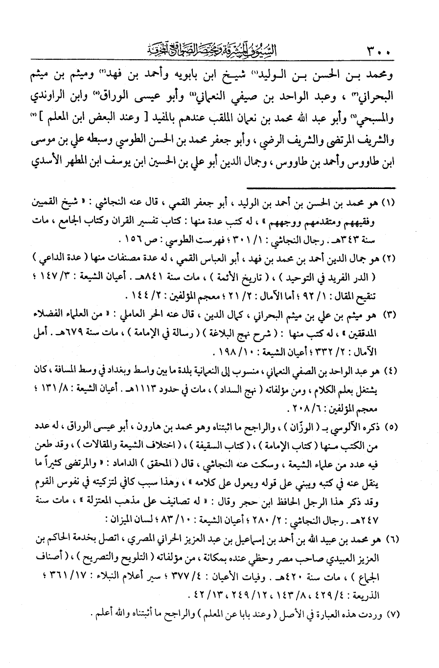 ومحمد بن الحسن بن الوليد شيخ ابن بابويه، وأحمد بن فهد وميثم بن ميثم البحراني وعبد الواحد بن صيفي النعماني وأبو عيسى الوراق وابن الراوندي والمسبحي وأبو عبد الله محمد بن نعمان الملقب عندهم بالمفيد [وعند البعض ابن المعلم] والشريف المرتضى والشريف الرضي وأبو جعفر محمد بن الحسن الطوسي وسبطه علي بن موسى بن طاووس وأحمد بن طاووس وجمال الدين أبو علي بن الحسين بن يوسف بن المطهر الأسدي