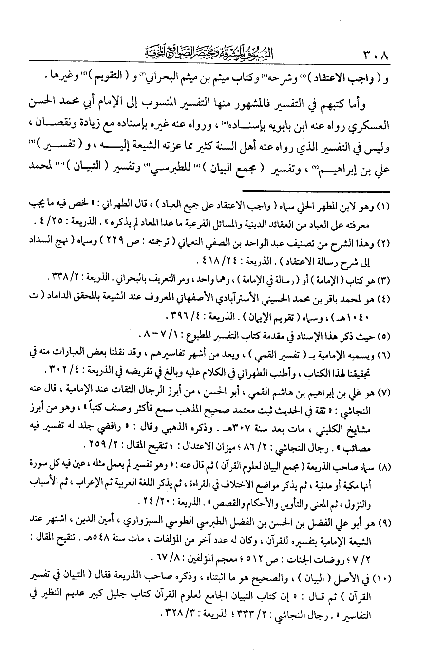 وأما كتبهم في التفسير: فالمشهور منها التفسير المنسوب إلى الإمام أبي محمد الحسن العسكري -رواه عنه ابن بابويه بإسناده، ورواه عنه غيره بإسناد مع زيادة ونقصان، وليس في التفسير الذي رواه عنه أهل السنة كثير مما عزته الشيعة إليه- وتفسير علي بن إبراهيم وتفسير مجمع البيان للطبرسي وتفسير التبيان لمحمد