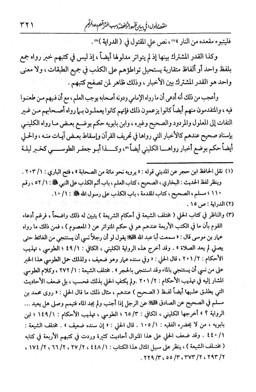 فليتبوأ مقعده من النار» نص عليه المقتول في البداية. وكذا القدر المشترك بينها، إذ لم يتواتر مدلولها أيضا، إذ ليس في كتبهم خبر رواه جمع بلفظ واحد أو ألفاظ متقاربة يستحيل تواطؤهم على الكذب في جميع الطبقات، ولا معنى واحد لأنه هو القدر المشترك بين الأخبار. وذلك ظاهر لمن تصفح كتبهم.