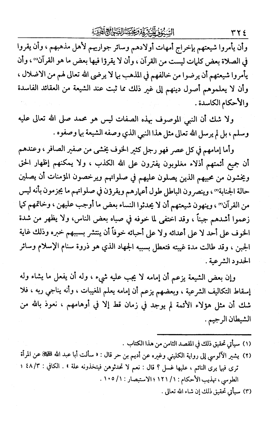 وأما إمامهم في كل عصر: فهو رجل كثير الخوف، يخشى من صفير الصافر. وعندهم أن جميع أئمتهم أذلاء مغلوبون، يفترون على الله الكذب، ولا يمكنهم إظهار الحق، ويخشون من محبيهم الذين يصلون عليهم في صلواتهم، ويرخصون المؤمنات أن يصلين حالة الجنابة، وينصرون الباطل طول أعمارهم، ويقرؤون في صلواتهم ما يجزمون بأنه ليس من القرآن، وينهون شيعتهم عن أن يحدثوا النساء بعض ما وجب عليهن. وخاتمهم كما زعموا أشدهم جبنا، وقد اختفى لما خوّفه في صباه بعض الناس، ولا يظهر من شدة الخوف على أحد، لا على أعدائه ولا على أحبائه، خوفا أن ينتشر بسببهم خبره، وذلك غاية الجبن. وقد طالت مدة غيبته، فتعطل بسببه الجهاد الذي هو ذروة سنام الإسلام، وسائر الحدود الشرعية، وأن بعض الشيعة يزعم أن إمامه لا يجب عليه شيء، وله أن يفعل ما يشاء، وله إسقاط التكاليف الشرعية. وبعضهم يزعم أن إمامه يعلم المغيبات وأنه يناجي ربه.