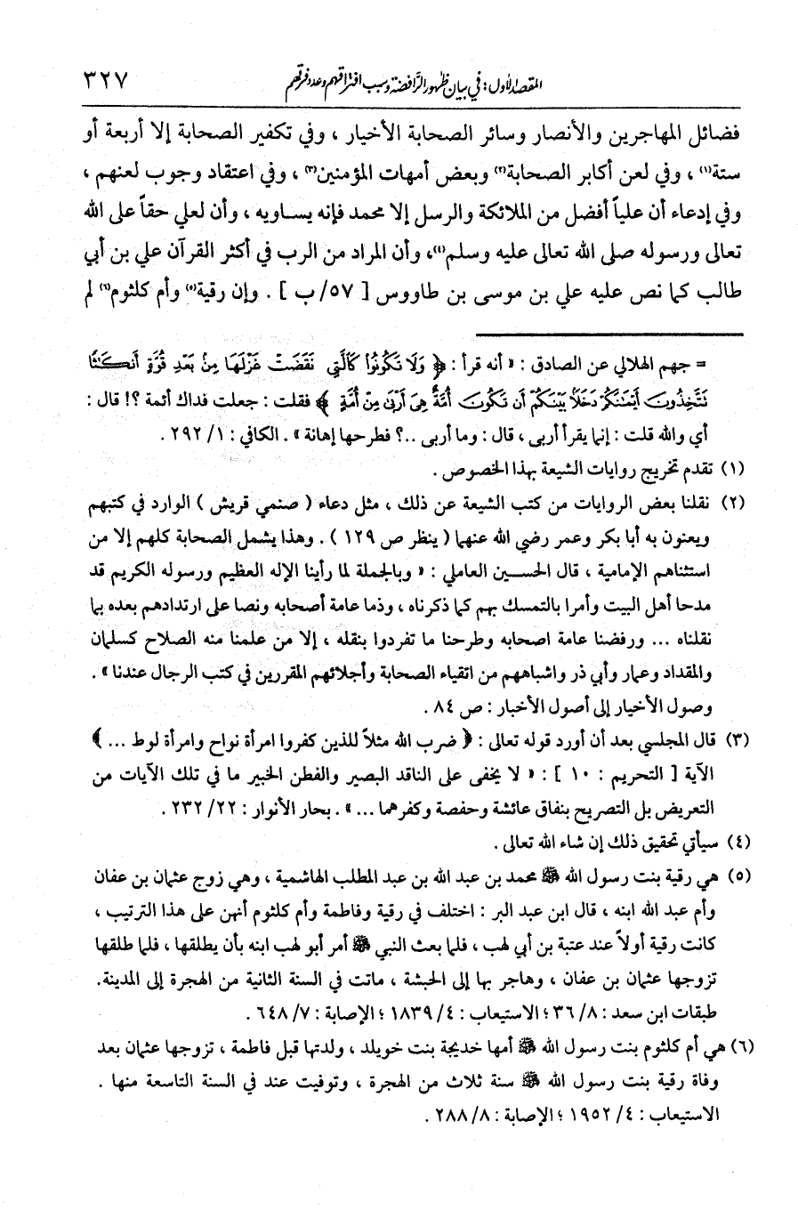 فضائل المهاجرين والأنصار وسائر الصحابة الأخيار، وفي تكفير الصحابة كلهم إلا أربعة أو ستة، وفي لعن أكابر الصحابة وبعض أمهات المؤمنين، وفي اعتقاد وجوب لعنهم، وفي ادعاء أن عليا أفضل من الملائكة والرسل إلا محمد فإنه يساويه، وأن لعلي حقا على الله تعالى ورسوله - صلى الله عليه وسلم -. وأن المراد من الرب في أكثر القرآن علي بن أبي طالب، كما نص عليه علي بن موسى بن طاووس، وأن رقية وأم كلثوم لم