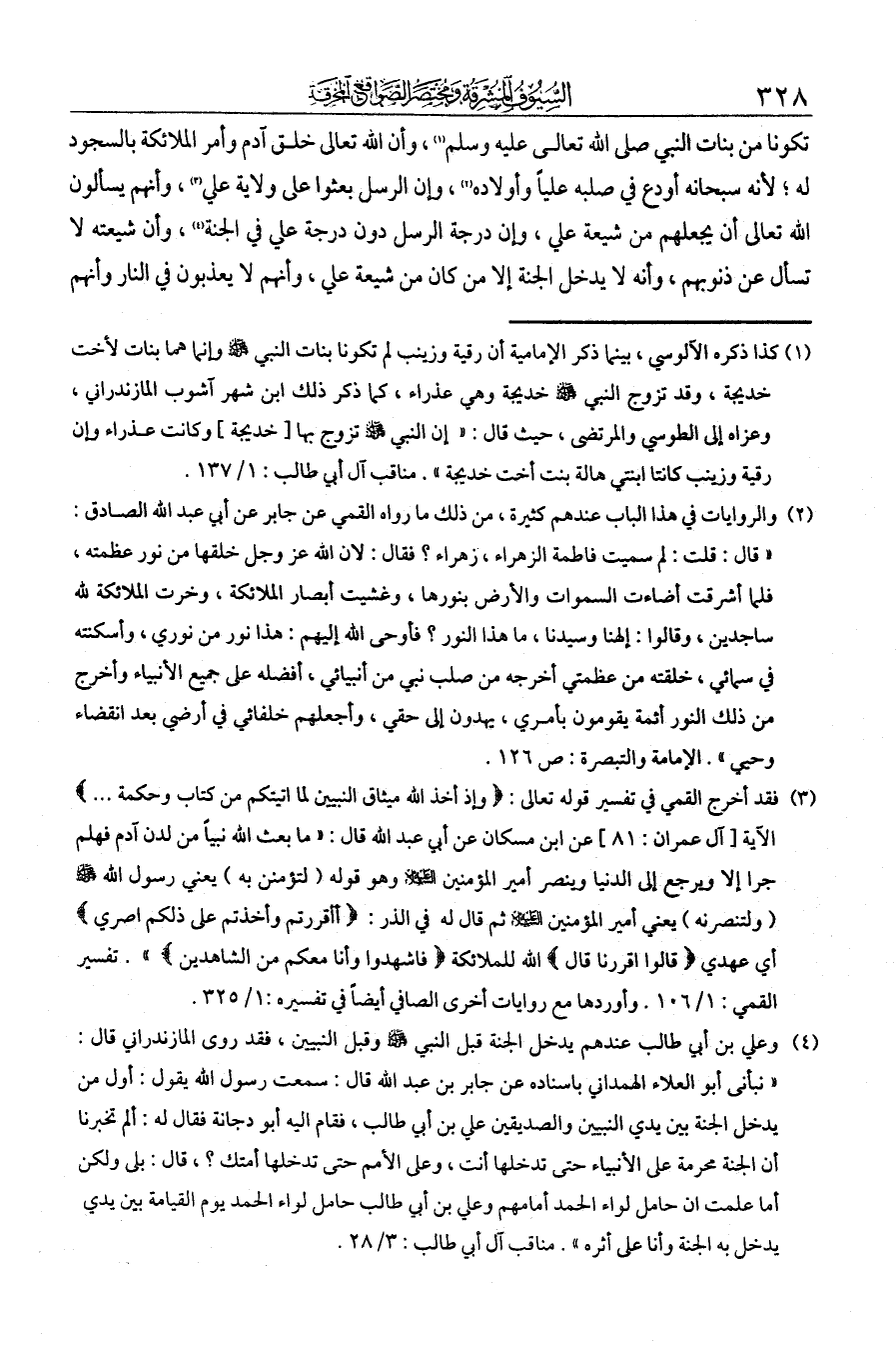 تكونا من بنات النبي - صلى الله عليه وسلم -. وأن الله تعالى خلق آدم وأمر الملائكة بالسجود له لأنه سبحانه أودع في صلبه عليا وأولاده، وأن الرسل بعثوا على ولاية علي، وأنهم يسألون الله تعالى أن يجعلهم من شيعة علي. وأن درجة الرسل دون درجة علي في الجنة، وأن شيعته لا تسأل عن ذنوبهم، وأنه لا يدخل الجنة إلا من كان من شيعة علي، وأنهم لا يعذبون في النار، وأنهم