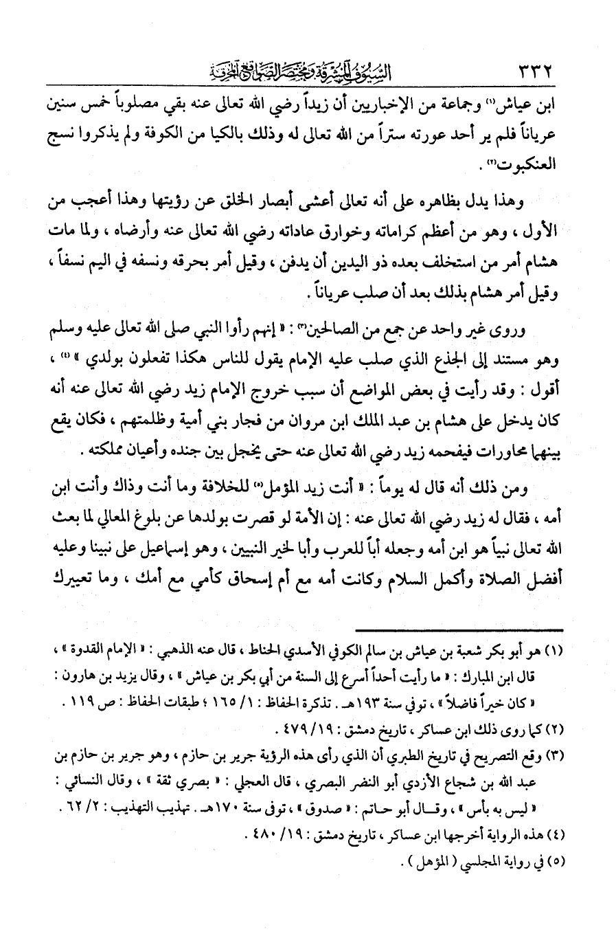 بن عياش وجماعة من الأخباريين أن زيدا رضي الله تعالى عنه بقي مصلوبا خمس سنين عريانا فلم ير أحد عورته سترا من الله تعالى له، وذلك بالكيا من الكوفة، ولم يذكروا نسج العنكبوت. وهذا يدل بظاهره على أنه تعالى أعشى أبصار الخلق عن رؤيتها، وهذا أعجب من الأول. وهو من أعظم كراماته وخوارق عاداته، رضي الله تعالى عنه وأرضاه. ولما مات هشام أمر من استخلف بعده - وهو ذو اليدين - أن يدفن، وقيل: أمر بحرقه ونسفه في اليم نسفا، وقيل: أمر هشام بذلك بعد أن صلب عريانا. وروى غير واحد عن جمع من الصالحين أنهم رأوا النبي - صلى الله عليه وسلم - وهو مستند إلى الجذع الذي صلب عليه الإمام يقول للناس: "هكذا تفعلون بولدي؟ "