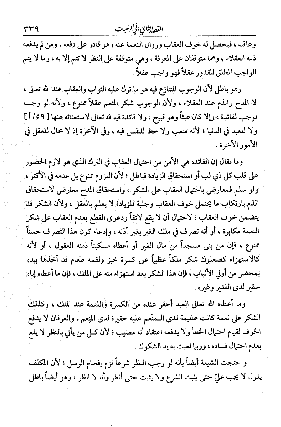 وما يقال: إن الفائدة هي الأمن من احتمال العقاب في الترك الذي هو لازم الحضور على قلب كل ذي لب أو استحقاق الزيادة فباطل؛ لأن اللزوم ممنوع، بل عدمه معلوم في الأكثر، ولو سلم فمعارض باحتمال العقاب على الشكر، واستحقاق المدح معارض لاستحقاق الذم بارتكاب ما يحتمل خوف العقاب، وجلبه للزيادة لا يعلم بالعقل، ولأن الشكر قد يتضمن خوف العقاب؛ لاحتمال أن لا يقع لائقا. ودعوى القطع بعدم العقاب على شكر النعمة مكابرة، أو أنه تصرف في ملك الغير بغير إذنه، وادعاء كون هذا التصرف حسنا ممنوع، فإن من بنى مسجدا من مال الغير أو أعطاه مسكينا ذمته العقول، أو لأنه كالاستهزاء كصعلوك شكر ملكا عظيما على كسرة خبز ولقمة طعام قد أخذها بيده بمحضر من أولي الألباب، فإن هذا الشكر يعد استهزاء منه على الملك، فإن ما أعطاه إياه حقير لدى الفقير وغيره، وما أعطاء الله تعالى العبد أحقر عنده من الكسرة واللقمة عند الملك، وكذلك الشكر على نعمة كانت عظيمة لدى المنعم عليه حقيرة لدى المنعم. والعرفان لا يدفع الخوف لقيام احتمال الخطأ، ولا يدفعه اعتقاد أنه مصيب، لأن كل من يأتي بالنظر لا يقطع بعدم احتمال فساده، وربما لعبت به الشكوك.