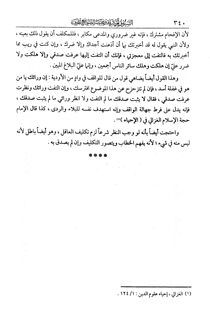 وهذا القول يضاهي قول من قال للواقف في واد من الأودية: إن وراءك يا من هو في غفلة أسد، فإن لم تتزحزح عن هذا الموضع افترسك، وإن التفت وراءك ونظرت عرفت صدقي، فقال: لا يثبت صدقك ما لم التفت، ولا أنظر ورائي ما لم يثبت صدقك. فإنه يدل على فرط جهالة الواقف وأنه استهدف نفسه للبلاء والردى. كذا قاله حجة الإسلام الغزالي في الإحياء.
