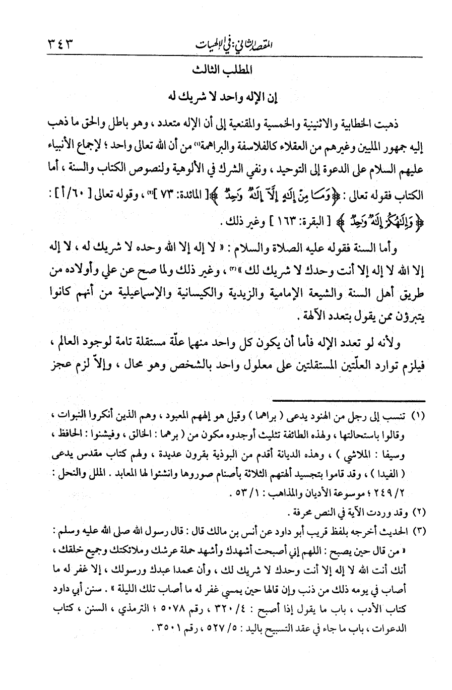والحق ما ذهب إليه جمهور المليين، وغيرهم من العقلاء كالفلاسفة والبراهمة، من أن الله تعالى واحد؛ لإجماع الأنبياء - عليهم السلام - على الدعوة إلى التوحيد، ونفي الشريك في الألوهية، ولنصوص الكتاب والسنة. أما الكتاب فقوله تعالى: {إنما الله إله واحد}، {لا إله إلا هو}، {وإلهكم إله واحد} وغير ذلك. وأما السنة فقوله عليه الصلاة والسلام: «لا إله إلا الله وحده لا شريك له»، «لا إله إلا الله»، «لا إله إلا أنت وحدك لا شريك لك»، وغير ذلك، ولما صح عن علي وأولاده من طريق أهل السنة والشيعة الإمامية والزيدية والكيسانية والإسماعيلية من أنهم كانوا يبرؤون ممن يقول بتعدد الآلهة. ولأنه لو تعدد الإله فإما أن يكون كل واحد منهما علة مستقلة تامة لوجود العالم، فيلزم توارد العلتين المستقلتين على معلول واحد بالشخص وهو محال، وإلا يلزم عجز