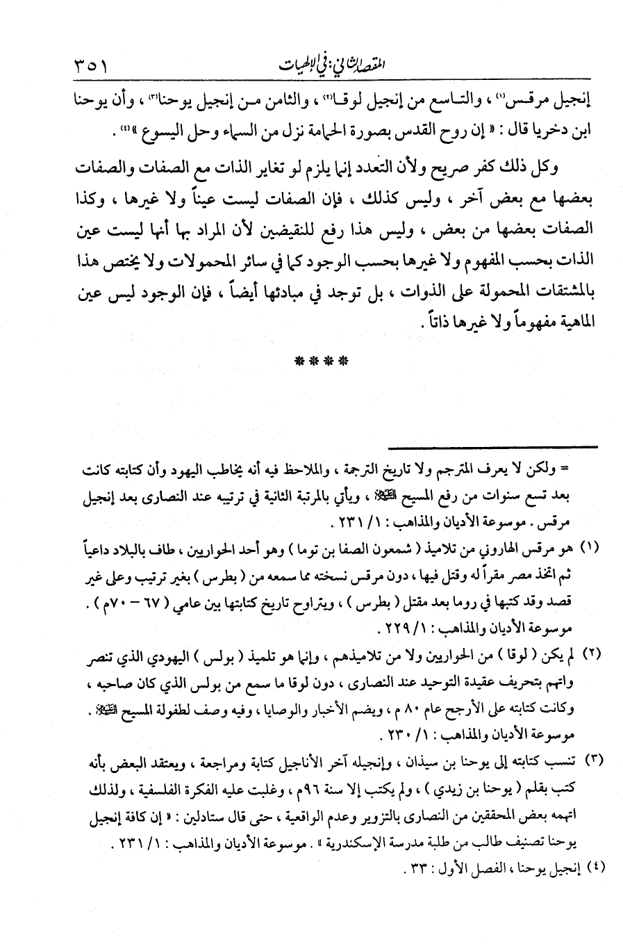 إنجيل مرقص والتاسع من إنجيل لوقا والثامن من إنجيل يوحنا أن يوحنا بن دخرما قال: "إن روح القدس بصورة الحمامة نزل من السماء وحل في اليسوع". وكل ذلك كفر صريح، ولأن التعدد إنما يلزم لو تغاير الذات مع الصفات، والصفات بعضها مع بعض آخر؛ وليس كذلك، فإن الصفات ليست عين الذات ولا غيرها، وكذا الصفات بعضها من بعض. وليس هذا رفع للنقيضين لأن المراد بها أنها ليست عين الذات بحسب المفهوم، ولا غيرها بحسب الوجود، كما في سائر المحمولات، ولا يختص هذا بالمشتقات المحمولة على الذوات، بل يوجد في مباديها أيضا، فإن الوجود ليس عين الماهية فهو ما ولا غيرها ذاتا.