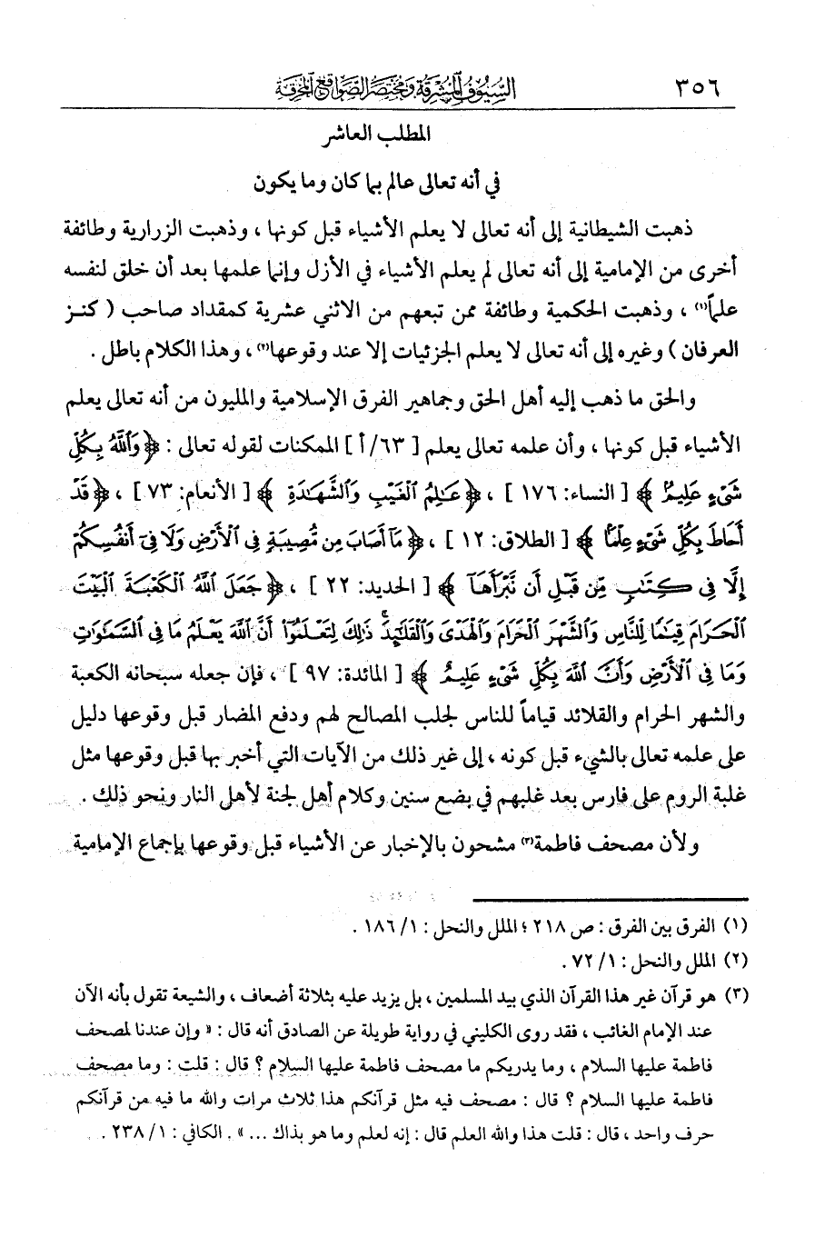 والحق ما ذهب إليه أهل الحق وجماهير الفرق الإسلامية والمليون من أنه تعالى يعلم الأشياء قبل كونها، وأن علمه تعالى يعم الممكنات؛ لقوله تعالى: {والله بكل شيء عليم}، {عالم الغيب والشهادة}، {قد أحاط بكل شيء علما}، {ما أصاب من مصيبة في الأرض ولا في أنفسكم إلا في كتاب من قبل أن نبرأها}، {جعل الله الكعبة البيت الحرام قياما للناس والشهر الحرام والهدي والقلائد ذلك لتعلموا أن الله يعلم ما في السماوات وما في الأرض وأن الله بكل شيء عليم} فإن جعله سبحانه الكعبة والشهر الحرام والقلائد قياما للناس لجلب المصالح لهم ودفع المضار قبل وقوعها دليل على علمه تعالى بالشيء قبل كونه، إلى غير ذلك من الآيات التي أخبر بها قبل وقوعها، مثل غلبة الروم على فارس بعد غلبهم في بضع سنين، وكلام أهل الجنة لأهل النار، ونحو ذلك. ولأن مصحف فاطمة مشحون بالأخبار عن الأشياء قبل وقوعها بإجماع الإمامية.