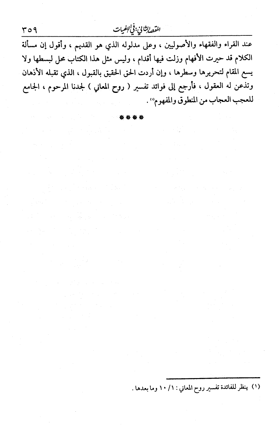 وأقول: إن مسألة الكلام قد حيرت الأفهام وزلت فيها أقدام، وليس مثل هذا الكتاب محلا لبسطها، ولا يسع المقام لتحريرها وسطرها. وإن أردت الحق الحقيق بالقبول الذي تقبله الأذهان وتذعن له العقول فارجع إلى فوائد تفسير روح المعاني لجدنا المرحوم الجامع للعجب العجاب من المنطوق والمفهوم.