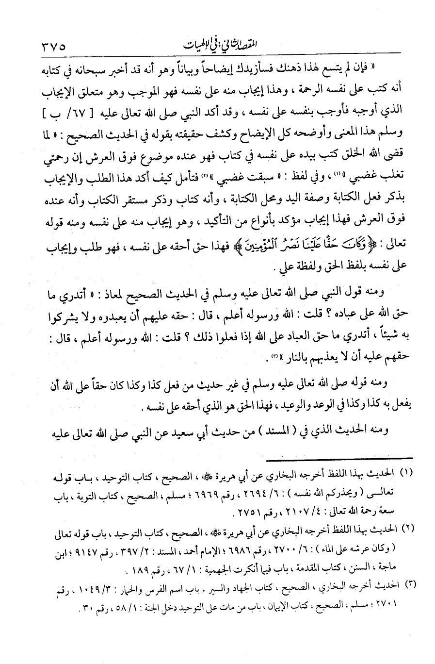 فإن لم يتسع لهذا ذهنك، فسأزيدك إيضاحا وبيانا، وهو أنه قد أخبر سبحانه في كتابه أنه كتب على نفسه الرحمة، وهذا إيجاب منه على نفسه، فهو الموجب، وهو متعلق الإيجاب الذي أوجبه، فأوجب بنفسه على نفسه. وقد أكد النبي - صلى الله عليه وسلم - هذا المعنى وأوضحه كل الإيضاح وكشف حقيقته بقوله في الحديث الصحيح: «لما قضى الله الخلق كتب بيده على نفسه في كتاب فهو عنده موضوع فوق العرش: إن رحمتي تغلب غضبي»، وفي لفظ: «سبقت غضبي». فتأمل كيف أكد هذا الطلب والإيجاب بذكر فعل الكتابة، وصفة اليد، ومحل الكتابة، وأنه كتاب، وذكر مستقر الكتاب وأنه عنده فوق العرش؛ فهذا إيجاب مؤكد بأنواع من التأكيد، وهو إيجاب منه على نفسه، ومنه قوله تعالى: {وكان حقا علينا نصر المؤمنين} فهذا حق أحقه على نفسه، فهو طلب وإيجاب على نفسه بلفظ {الحق} ولفظة {على}. ومنه قول النبي - صلى الله عليه وسلم - في الحديث الصحيح لمعاذ: «أتدري ما حق الله على عباده؟» قلت: الله ورسوله أعلم، قال: «حقه عليهم أن يعبدوه ولا يشركوا به شيئا، أتدري ما حق العباد على الله إذا فعلوا ذلك؟» قلت: الله ورسوله أعلم، قال: «حقهم عليه أن لا يعذبهم بالنار». ومنه قوله - صلى الله عليه وسلم -