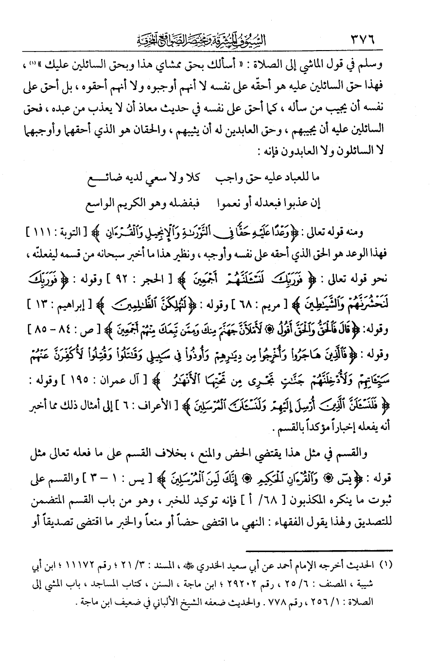 ومنه قوله تعالى: {وعدا عليه حقا في التوراة والإنجيل والقرآن} فهذا الوعد هو الحق الذي أحقه على نفسه وأوجبه. ونظير هذا ما أخبر به سبحانه من قسمه ليفعلنه، نحو قوله تعالى: {فوربك لنحشرنهم والشياطين} وقوله: {لنهلكن الظالمين} وقوله: {قال فالحق والحق أقول * لأملأن جهنم منك وممن تبعك منهم أجمعين} وقوله: {فالذين هاجروا وأخرجوا من ديارهم وأوذوا في سبيلي وقاتلوا وقتلوا لأكفرن عنهم سيئاتهم ولأدخلنهم جنات تجري من تحتها الأنهار} وقوله: {فلنسألن الذين أرسل إليهم ولنسألن المرسلين} إلى أمثال ذلك مما أخبر أنه يفعله إخبارا مؤكدا بالقسم. والقسم في مثل هذا يقتضي الحض والمنع، بخلاف القسم على ما فعله تعالى، مثل قوله: {يس * والقرآن الحكيم * إنك لمن المرسلين} والقسم على ثبوت ما ينكره المكذبون فإنه توكيد للخبر، وهو من باب القسم المتضمن للتصديق، ولهذا يقول الفقهاء: النهي ما اقتضى حضا أو منعا، والخبر ما اقتضى تصديقا أو
